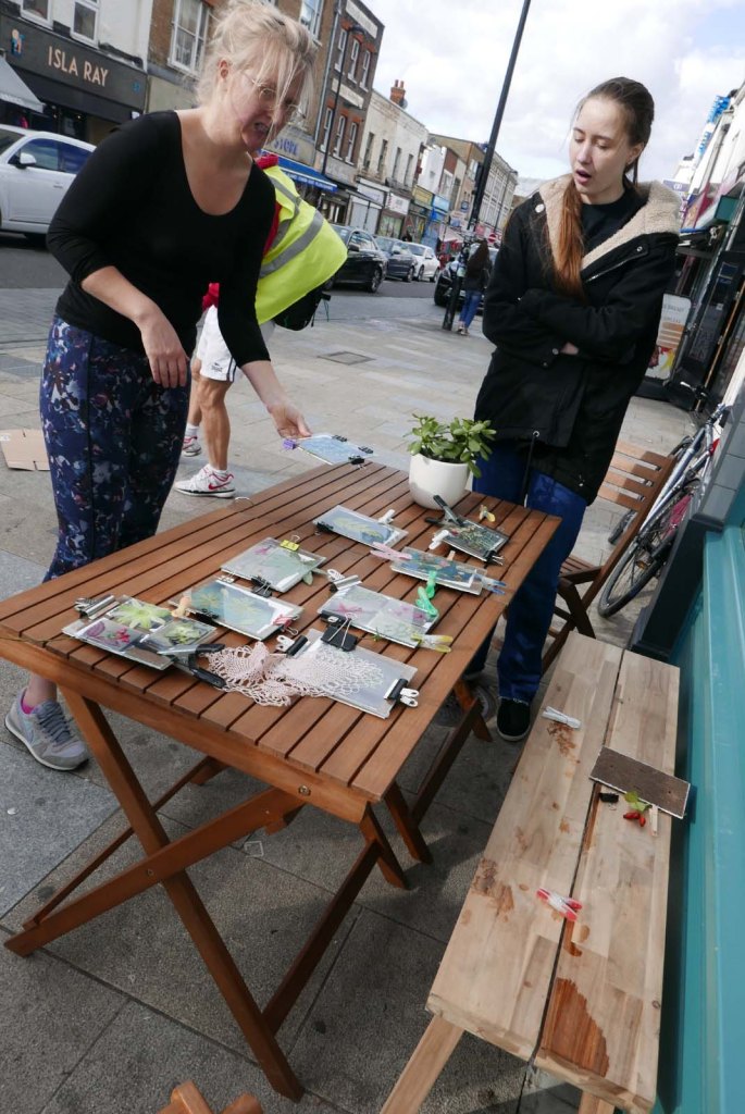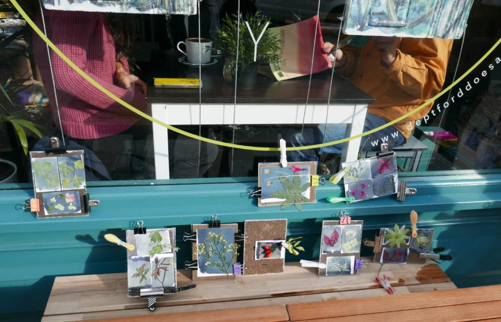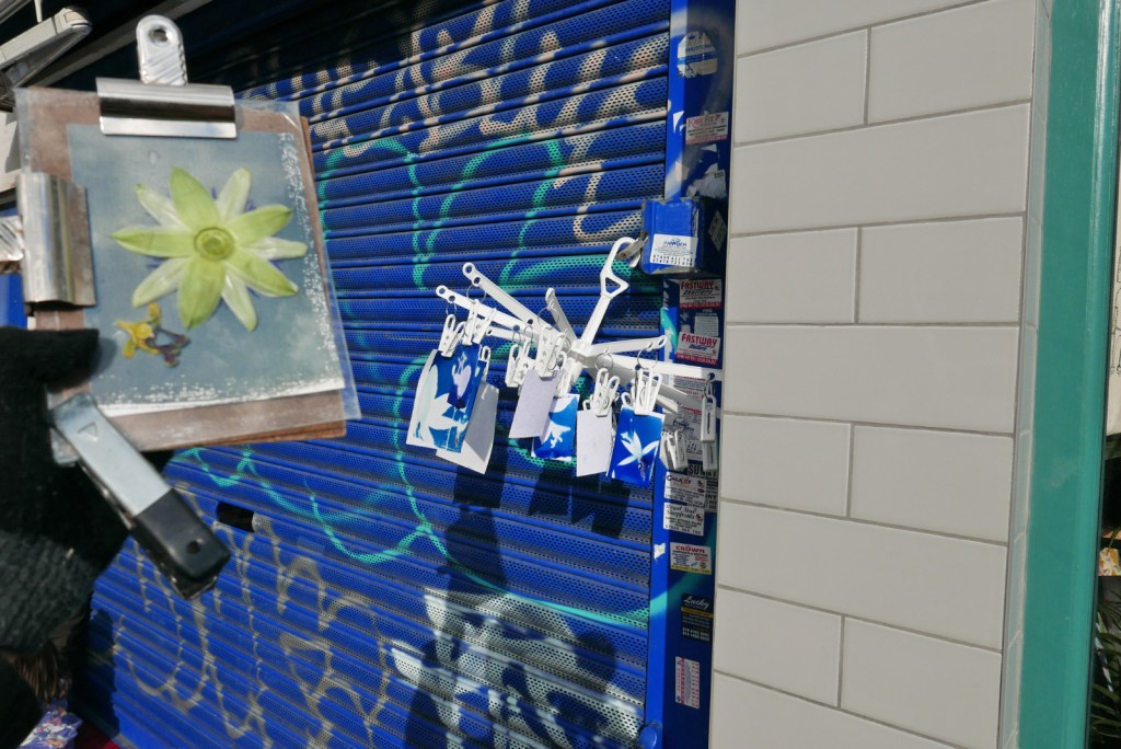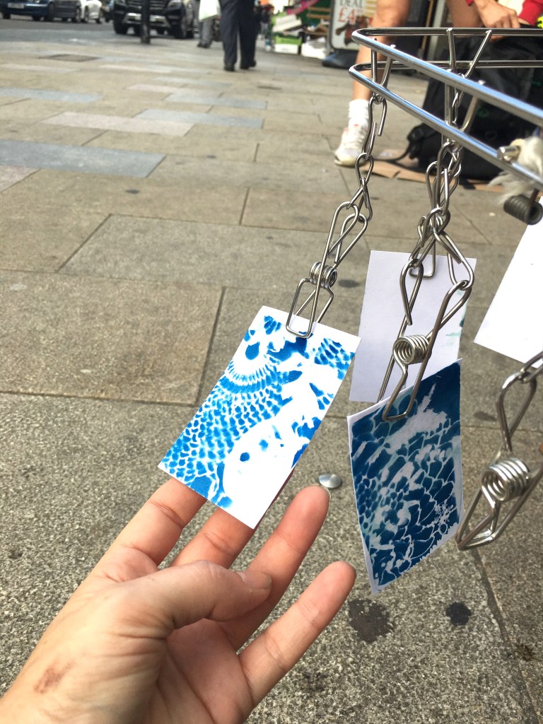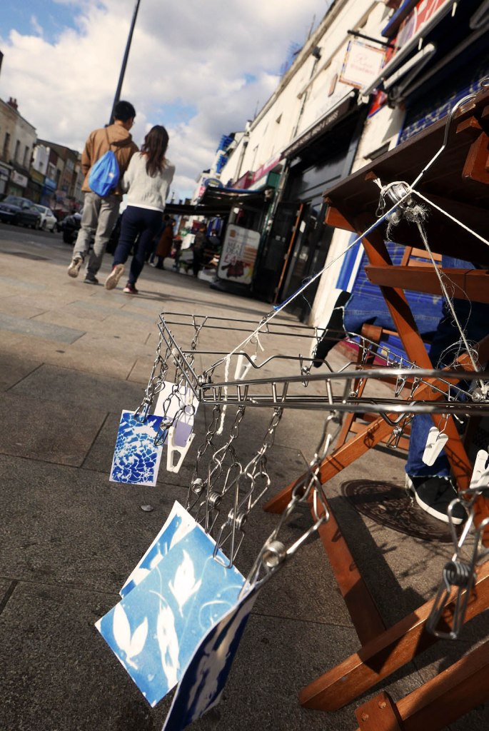 Held a wonderful workshop at Deptford Does Art Gallery in conjunction with the “SAGE” art exhibition. We made mini cyanotype cards. We walked the High Street to collect local weeds and objects, laid them into artistic compositions inside the gallery, and then exposed them to sunlight in the Street. Many passers-by stopped and watched and chatted.