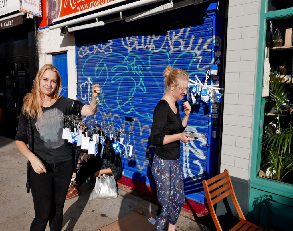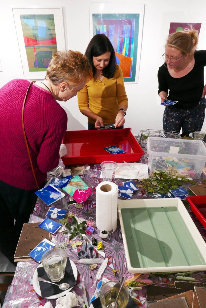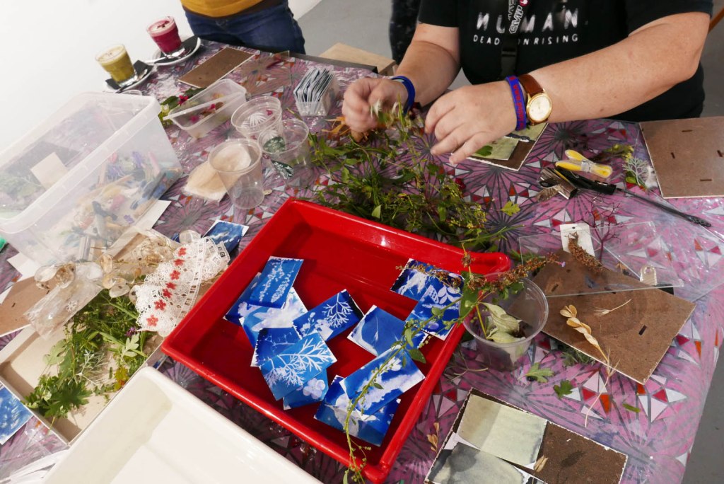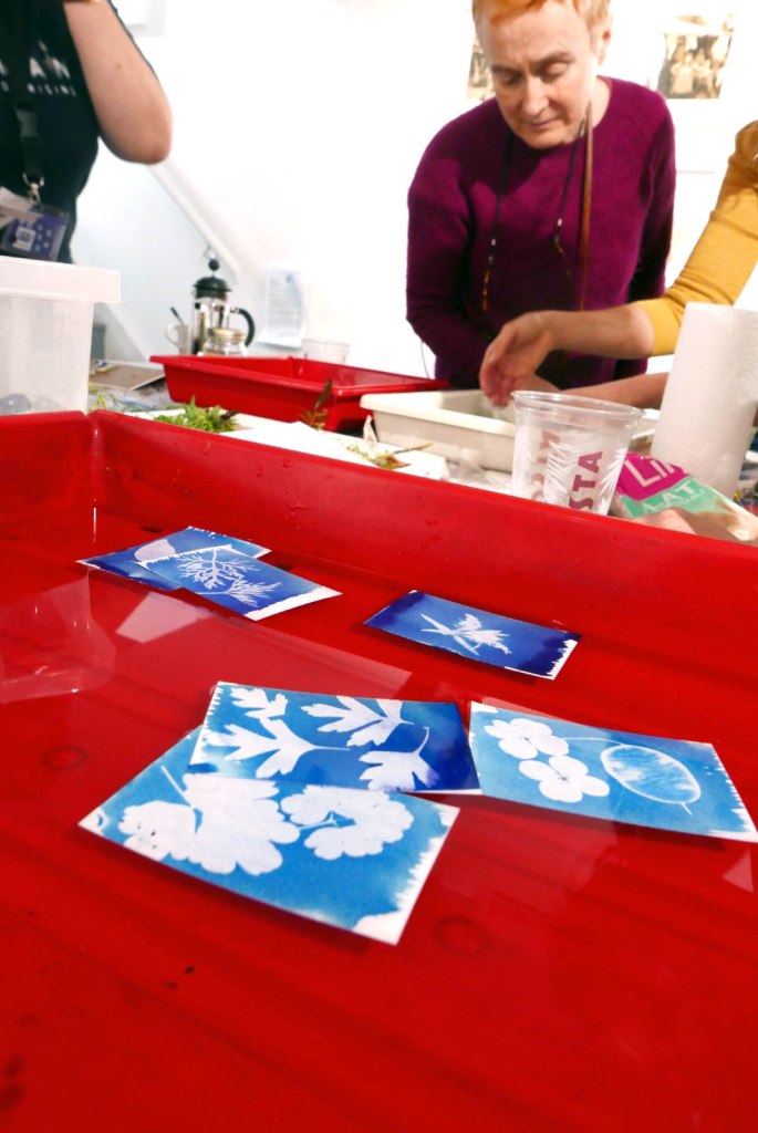 Held a wonderful workshop at Deptford Does Art Gallery in conjunction with the “SAGE” art exhibition. We made mini cyanotype cards. We walked the High Street to collect local weeds and objects, laid them into artistic compositions inside the gallery, and then exposed them to sunlight in the Street. Many passers-by stopped and watched and chatted.