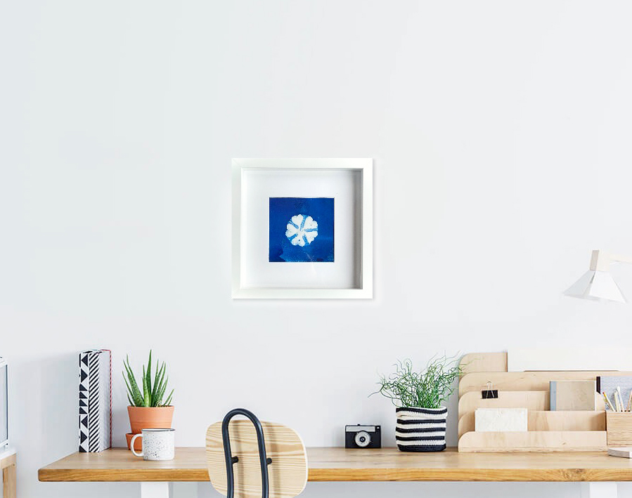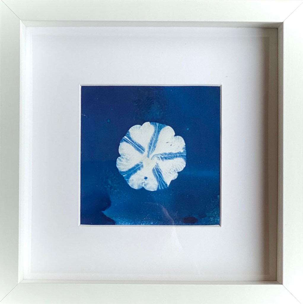 During lockdown I made “Cyanotype” sunprints in my back garden. Cyanotype is an early photographic process dating back to the 1800s, pioneered by Anna Atkins who used the technique for botanical books. I coat my paper in the dark, and then place flowers on top in the sunshine. Where the sun can penetrate the paper turns blue upon development. Cyanotype is extremely robust and you can expect these prints to last more than 100yrs.