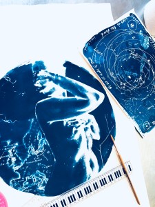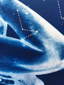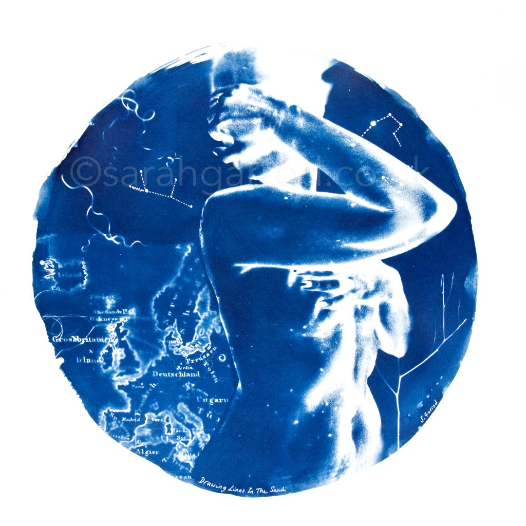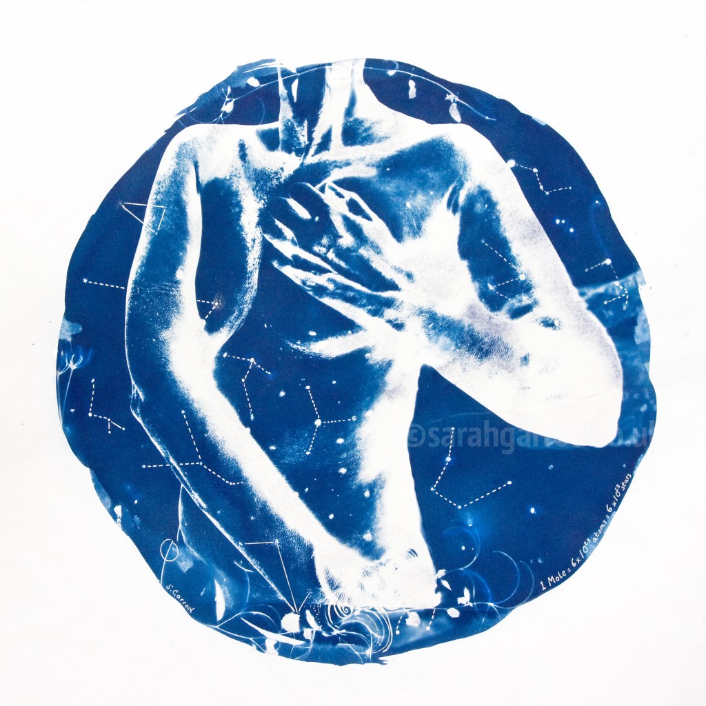 This series of 4 large cyanotypes (sun prints) were created for the “Cartographies” exhibition as part of the Urban Photo Festival. Sarah mapped her moles as if they were stars in the cosmos. In an attempt to map our place in the larger universe, each work explores a different scientific theory.