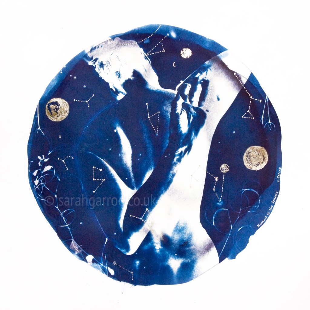 These prints were made by using the Cyanotype technique of photography that dates back to 1800s. Sarah coated the paper in darkness using a mixture of chemicals. She laid plants, her enlarged negatives, and old maps onto the paper and exposed it to the sun. Prints are developed in water, and have longlasting archival properties. Finally she connected the constellations of moles with drawn lines, and added silver leaf for the planets on ‘Music of The Spheres’.