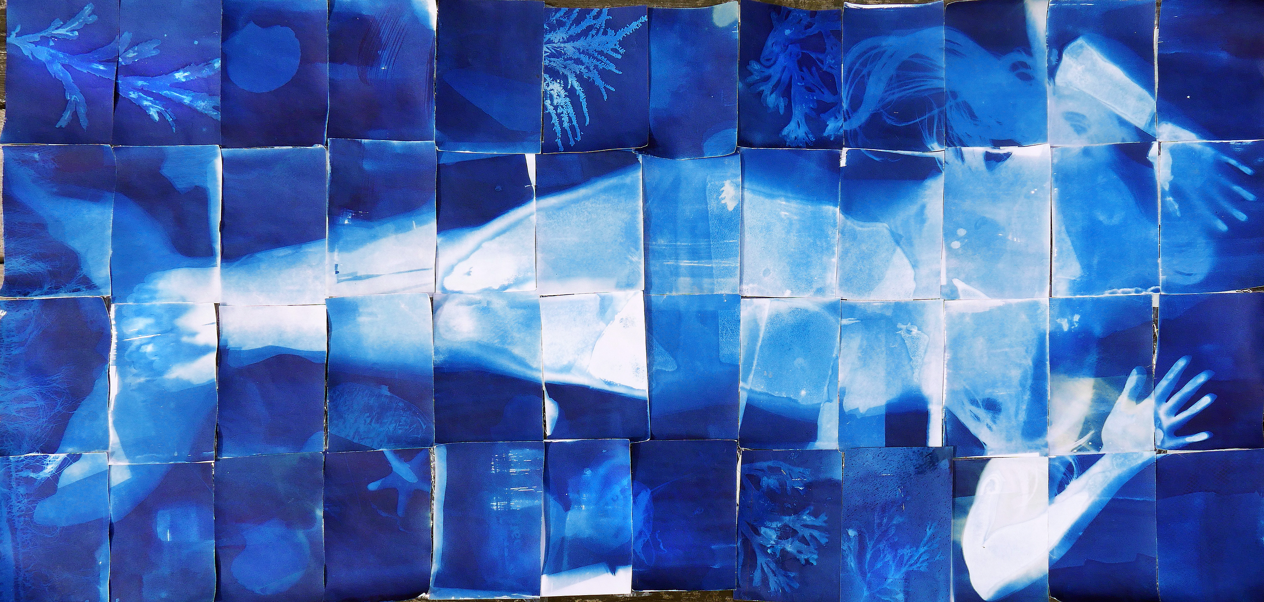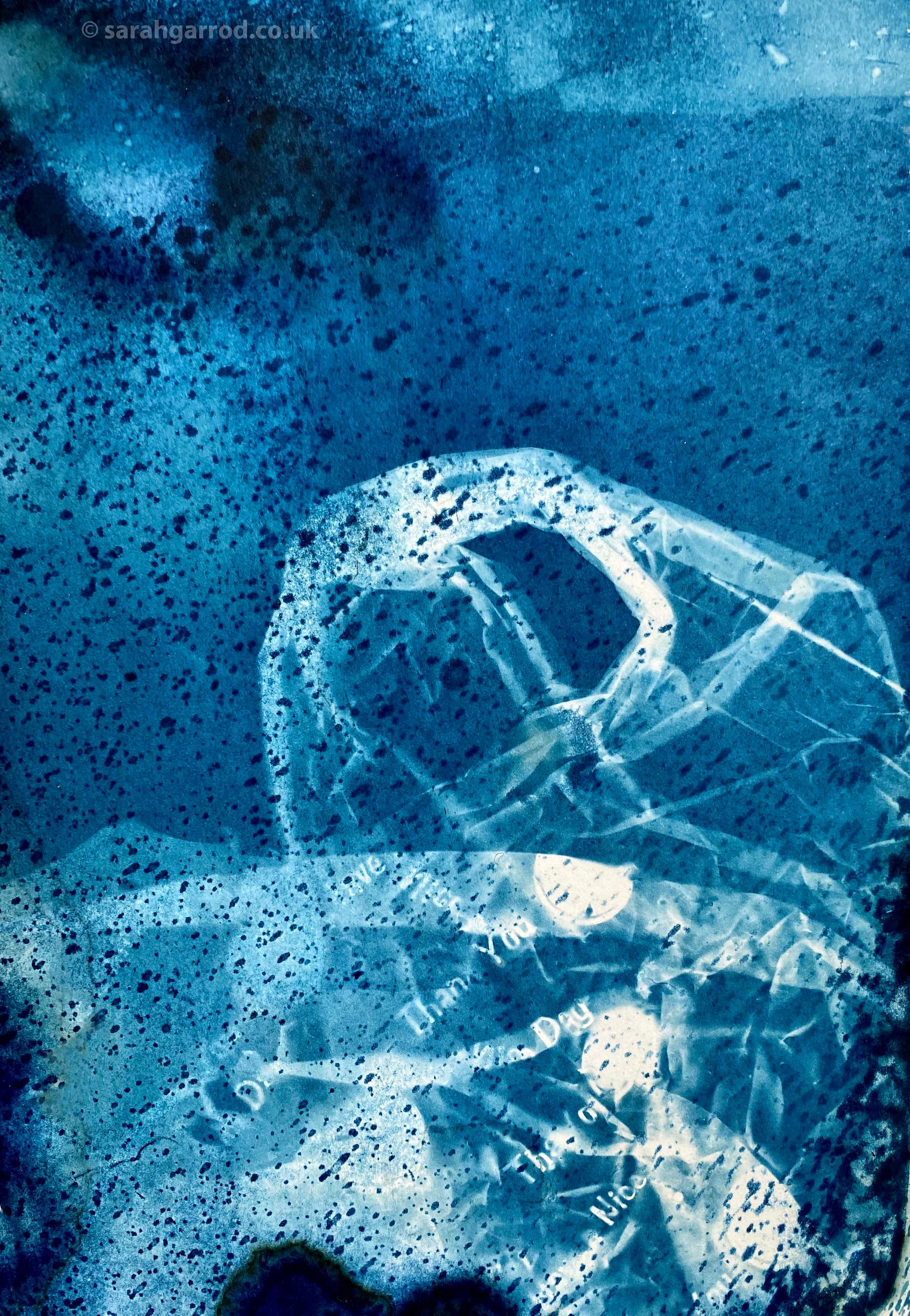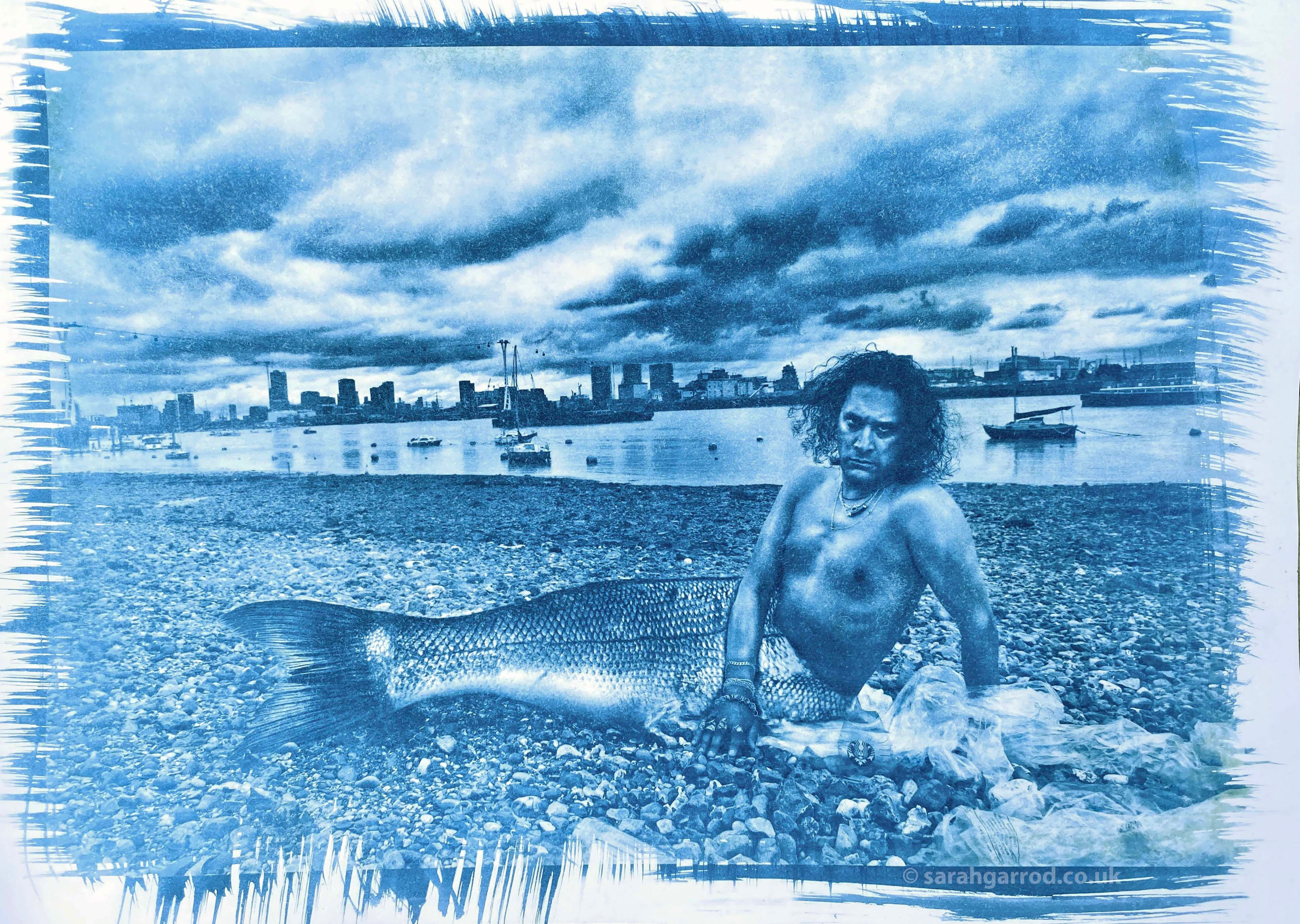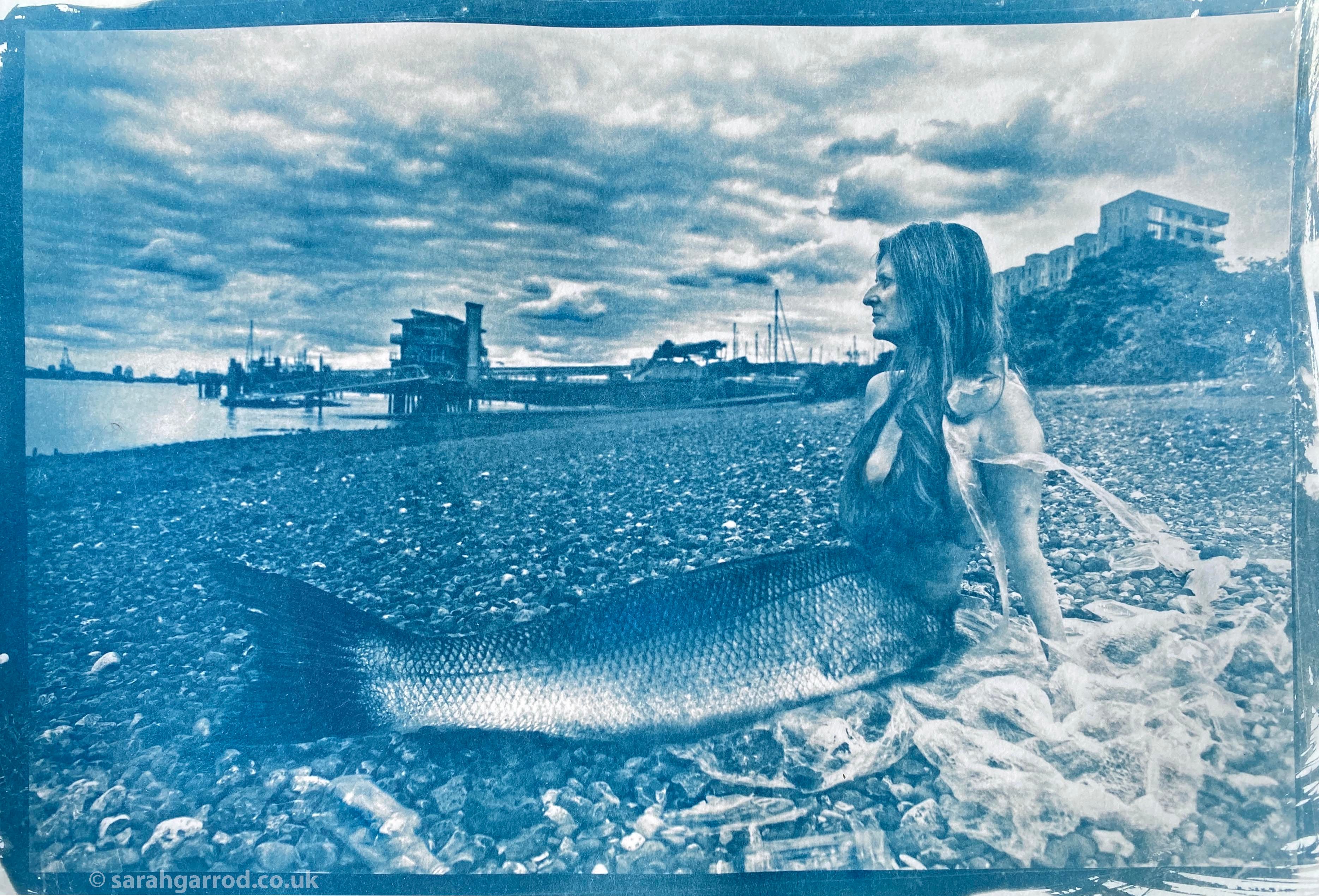 At the local London Marathon, alongside the Thames, I was struck by thousands of plastic bottles discarded by runners. What if these were killing the mermaids? I began a series of sunprints exploring this. The mythical creatures being “trapped” in a surreal world below the waterline. Sun, real river water, seaweed, and plastics combined their magic to produce this series from Nature.