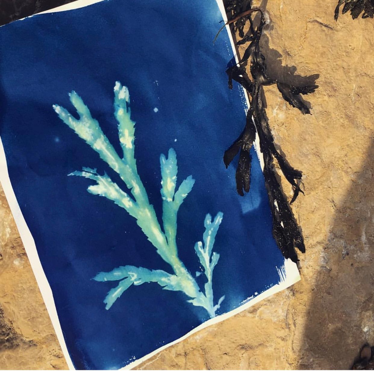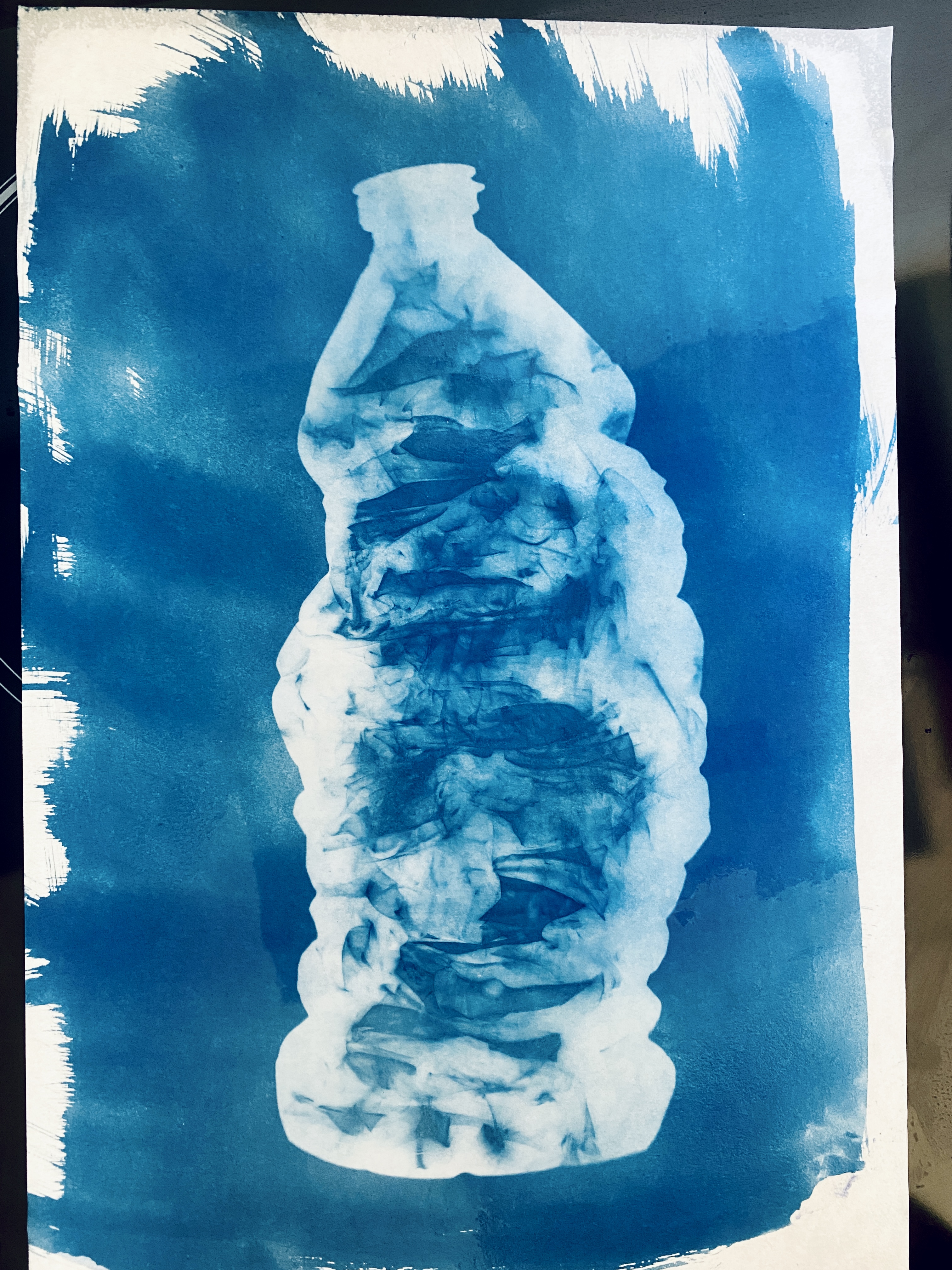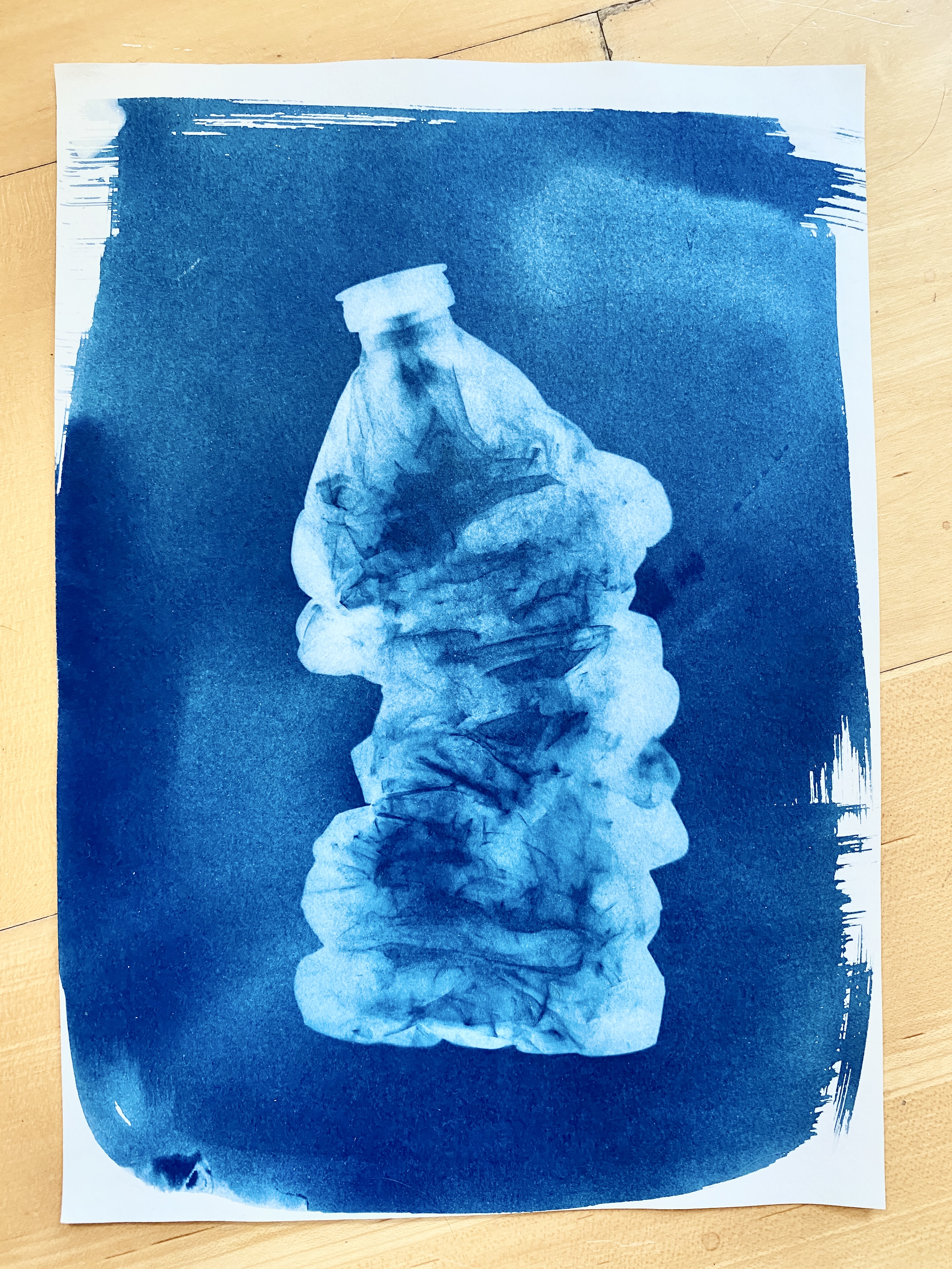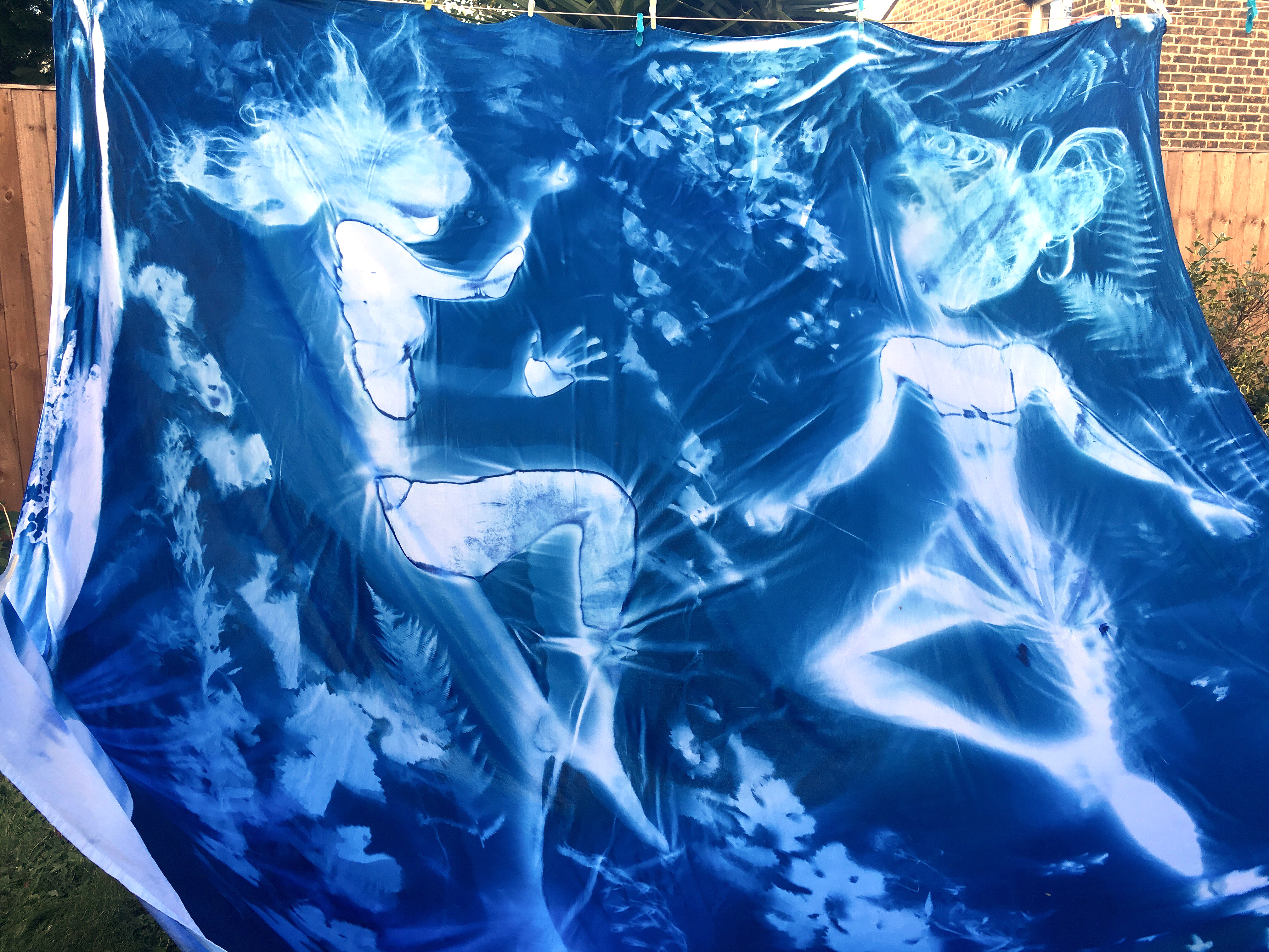 At the local London Marathon, alongside the Thames, I was struck by thousands of plastic bottles discarded by runners. What if these were killing the mermaids? I began a series of sunprints exploring this. The mythical creatures being “trapped” in a surreal world below the waterline. Sun, real river water, seaweed, and plastics combined their magic to produce this series from Nature.