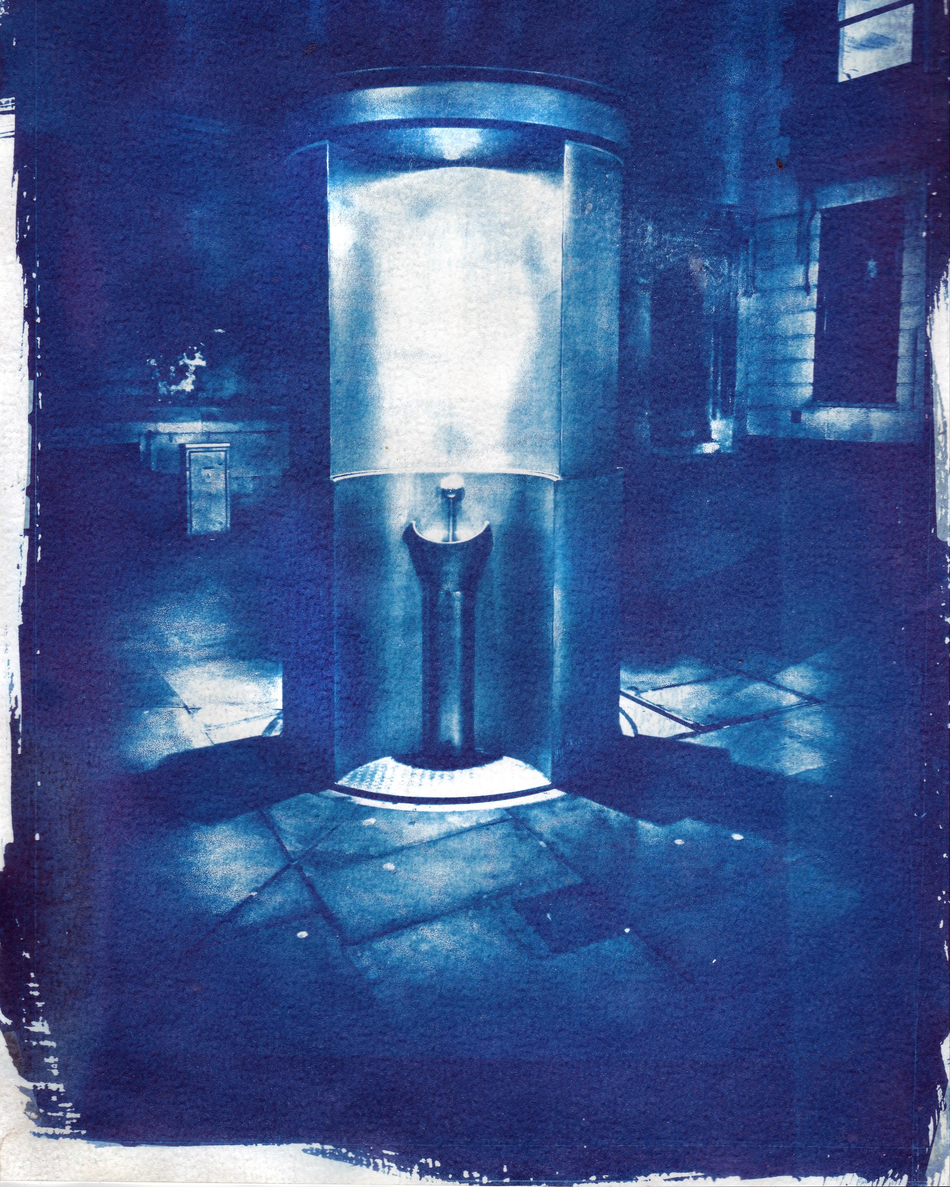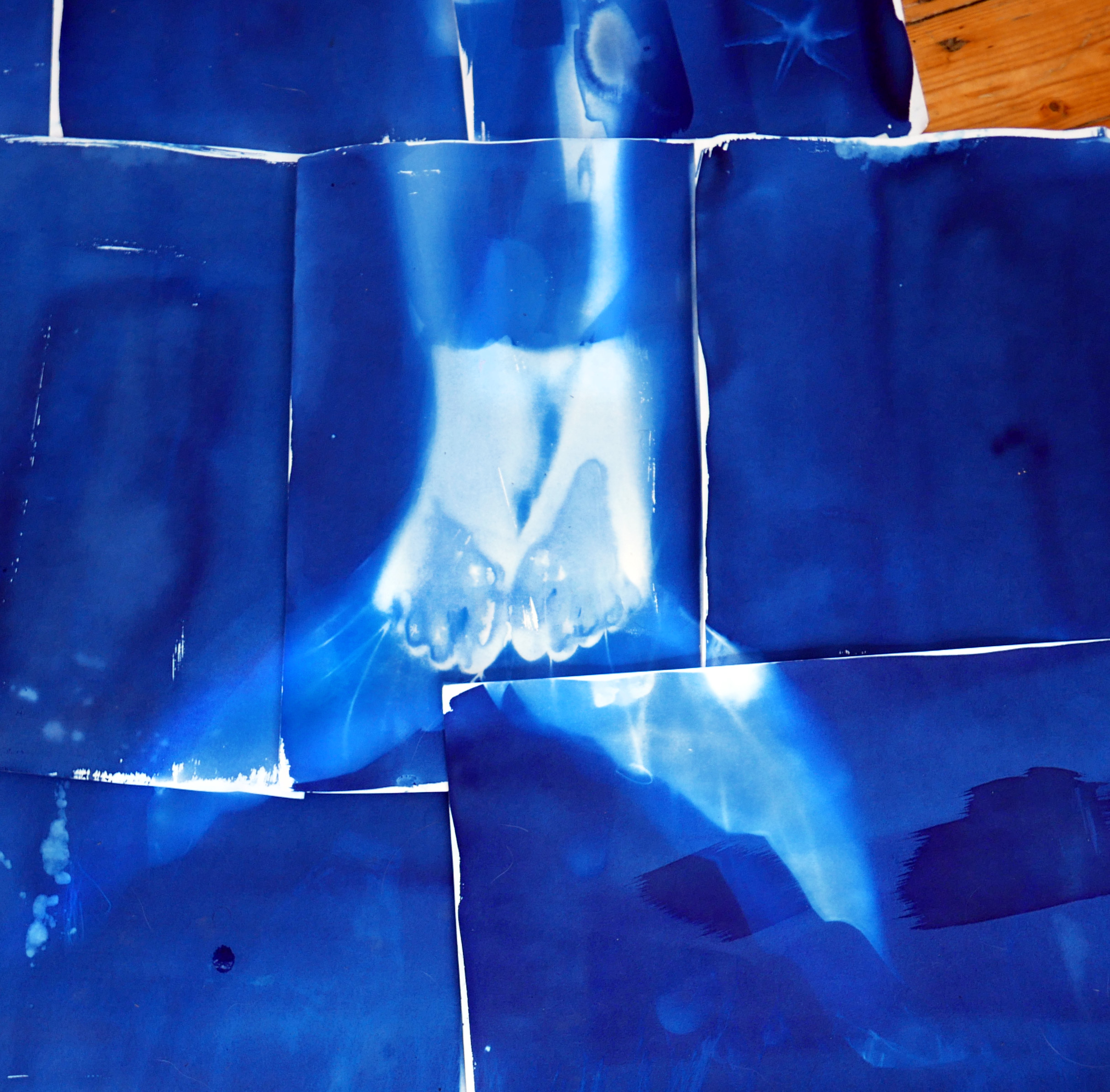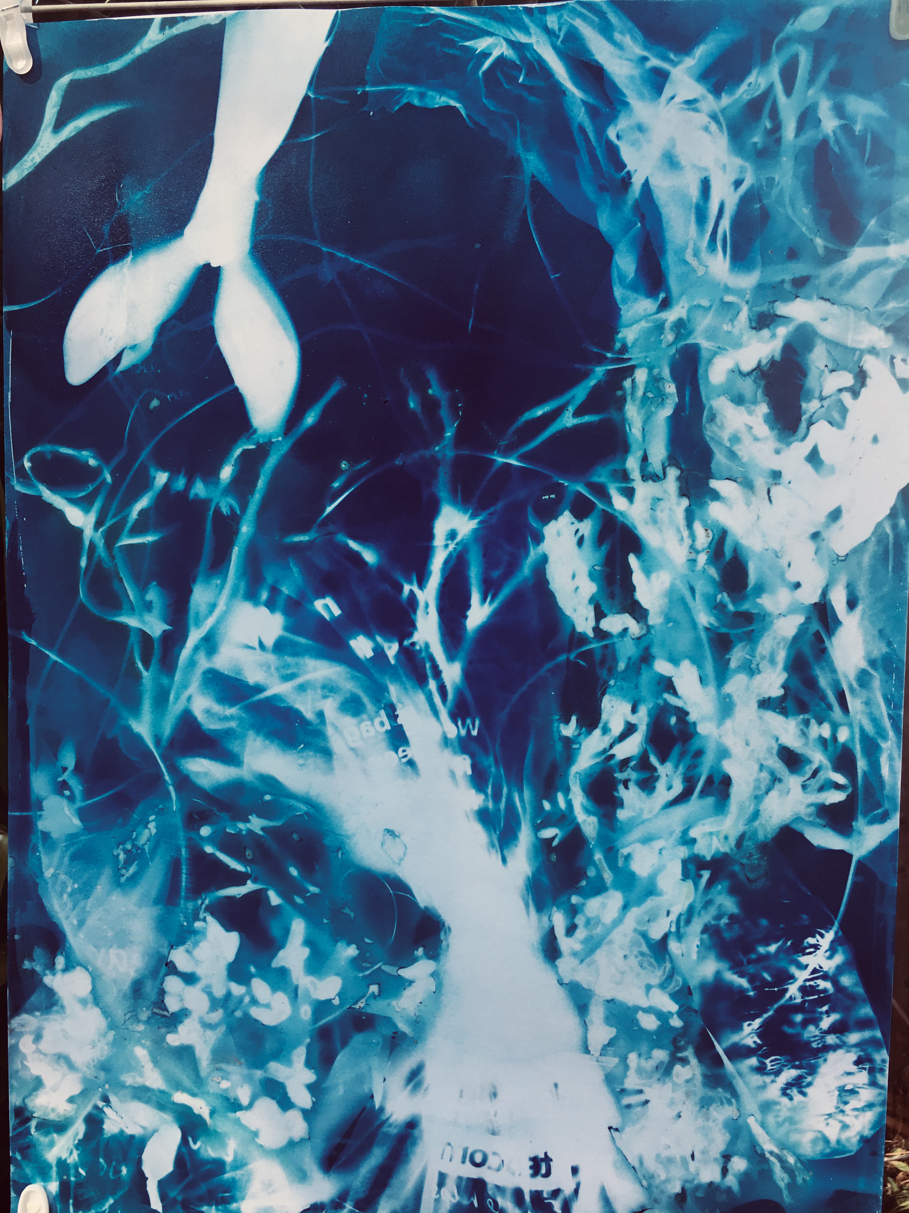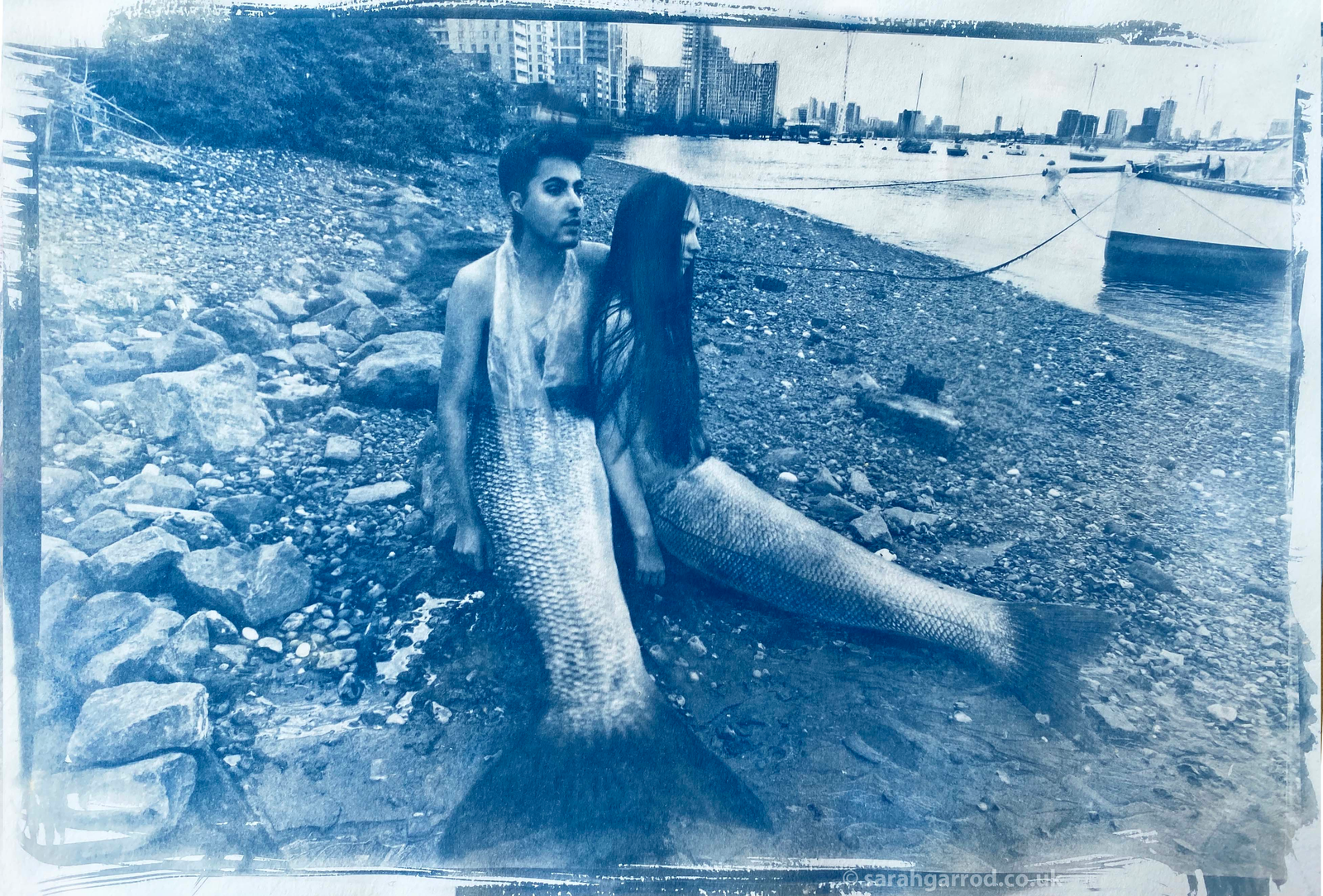 I can only “see” the mermaids through the victorian Cyanotype process which is sensitive to certain frequencies of UV light that we can’t see with the naked eye. I take home a flask of Thames water which magically turns the image into a blueprint. You won’t be able to capture mermaids on a digital camera, except perhaps as a brief silver sparkle.