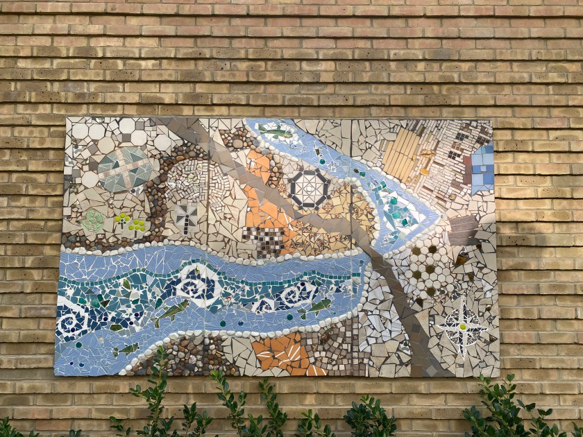 In 2024 I won another public art commission. “Lay of the Land” was my large mosaic piece made over several months, constructed on 3 panels from recycled and waste materials. It was inspired by the Grand Surrey Canal that once ran below the Deptford Landings complex. My piece is a artistic impression of a birds’s eye view of the area, showing layers through time and different landmarks through history.