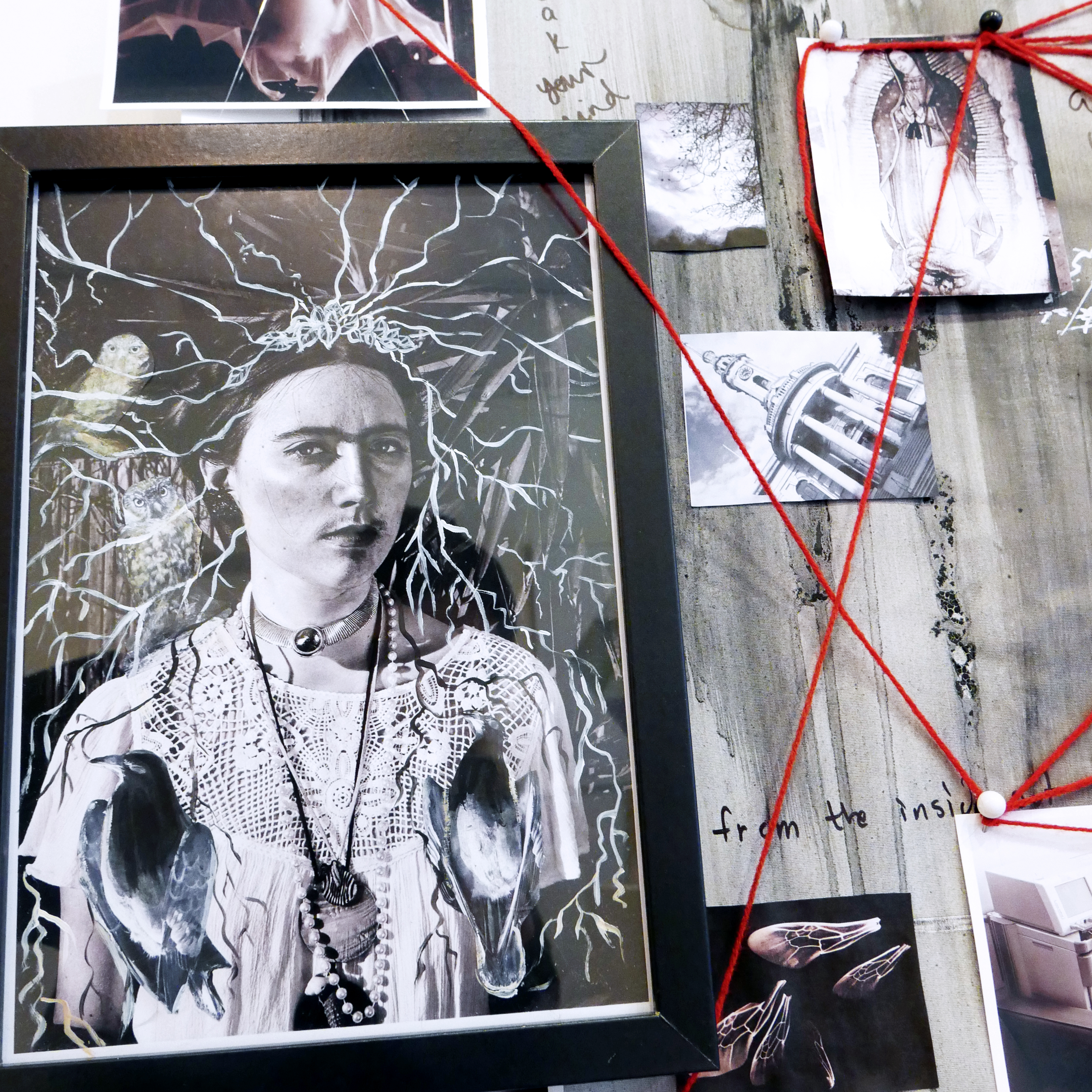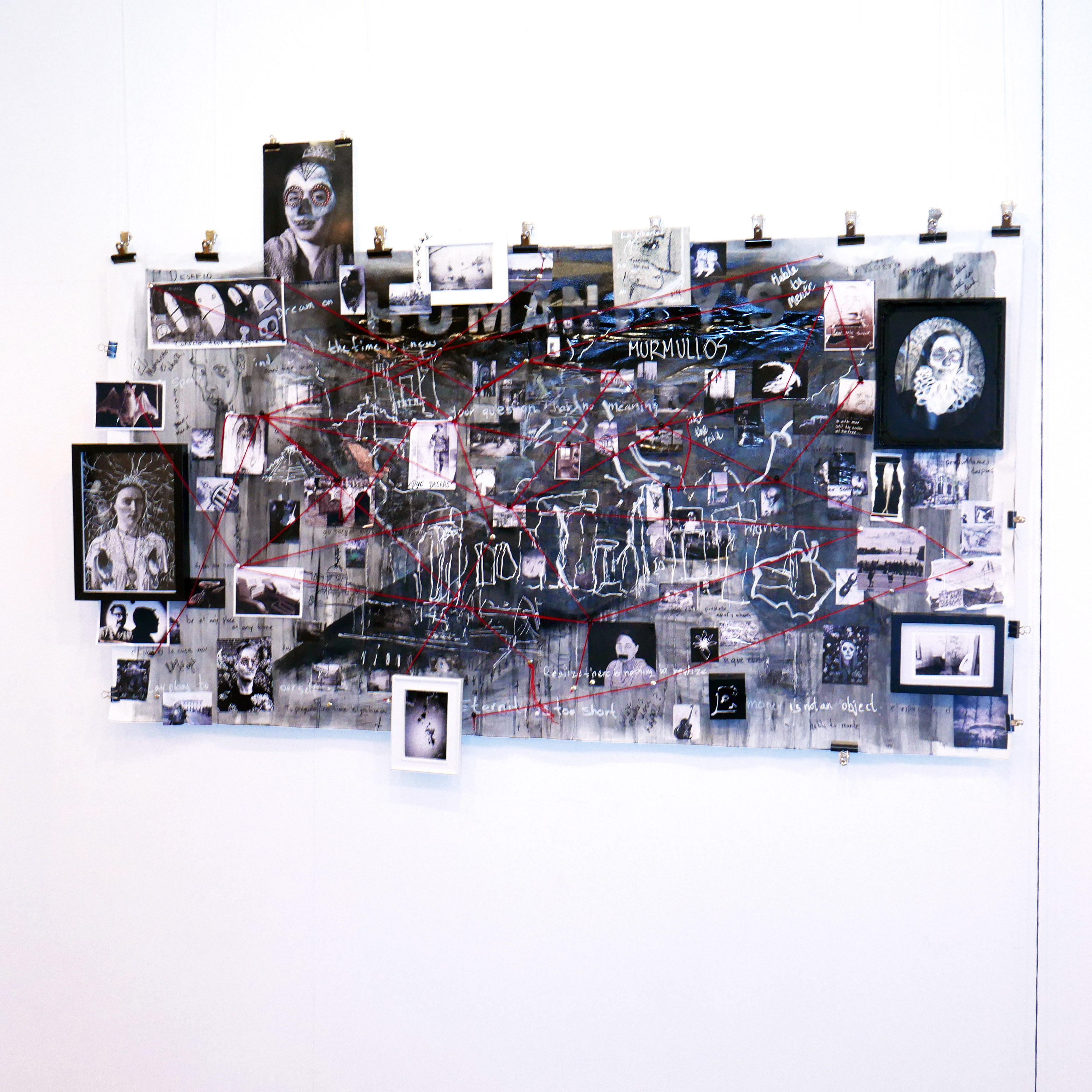 “Murmullos” (whispers) was a large scale multi-media installation at Espacio of Whitechapel Gallery, created in collaboration with artist Fernando Colquin. There were speakers inside the artwork and a soundtrack produced by Sarah, and UV light by Fernando. The piece investigated cross-cultural echoes between UK and Mexico, presented in the style of a crime scene map. Sarah investigated the work of Frida Khalo and the Day of the Dead tradition, in her hand painted portraits.