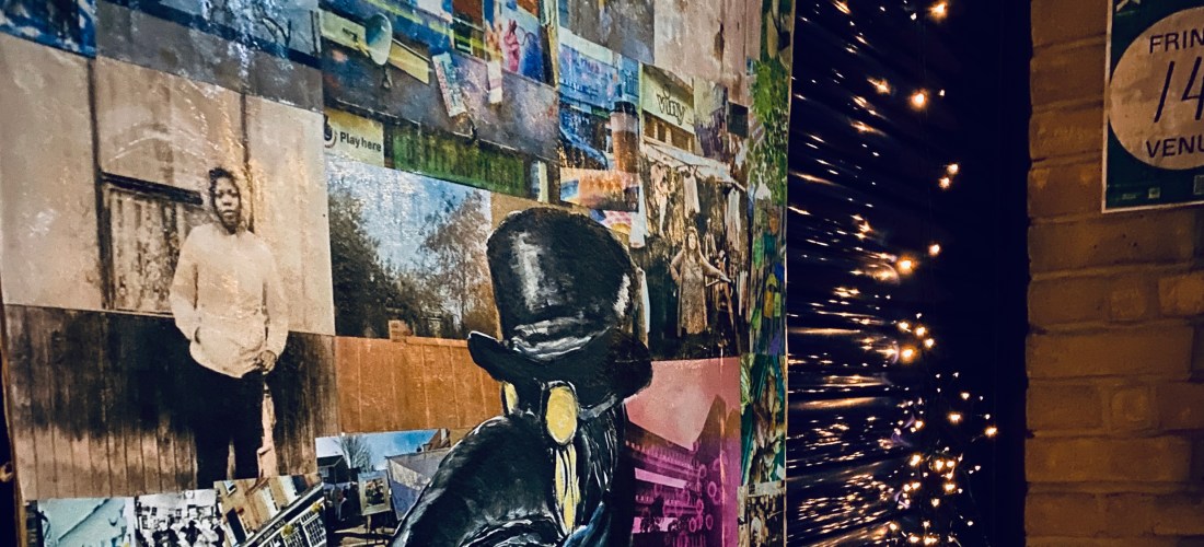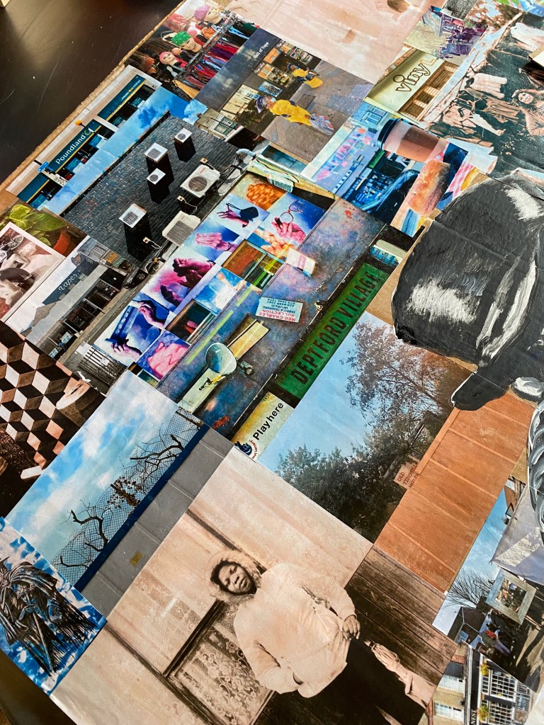 I was fed up with painting the black colourless figure! Then I ate some custard and thought that would be a good colour for his ‘all seeing’ eye “. From there on it started to look like a GCSE art creation… but I’m ok with that. I know full well that if I had immaculately framed my stunning photos individually, they would have have had a very different impact. Instead, they are butted up against each other and give the impression of haphazard, slightly messy, clashing, loveable Deptford, The punky DIY assemblage also suited Overdrive music studios, where my piece hangs.