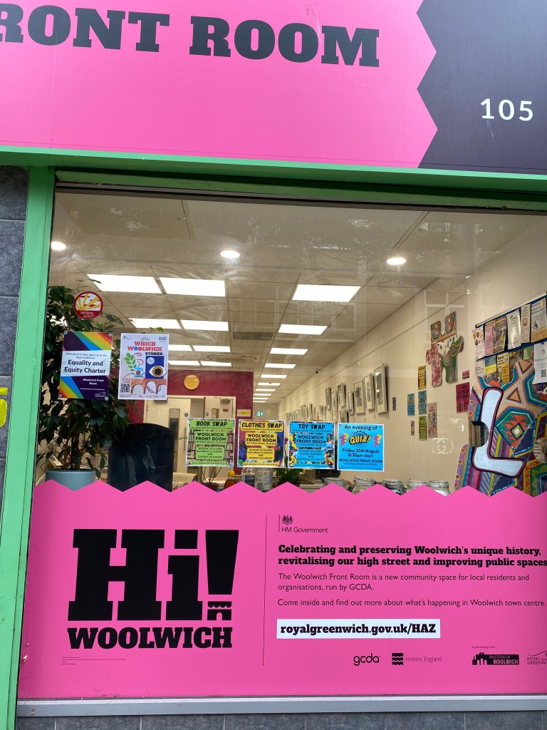 Woolwich Front Room is a lively community space and gallery which can be found on the main shopping street, Powis St. It is about 5-10mins walk from Woolwich Arsenal Which is on British Rail (from London Bridge etc), the DLR , and Woolwich station on the Elizabeth Line.