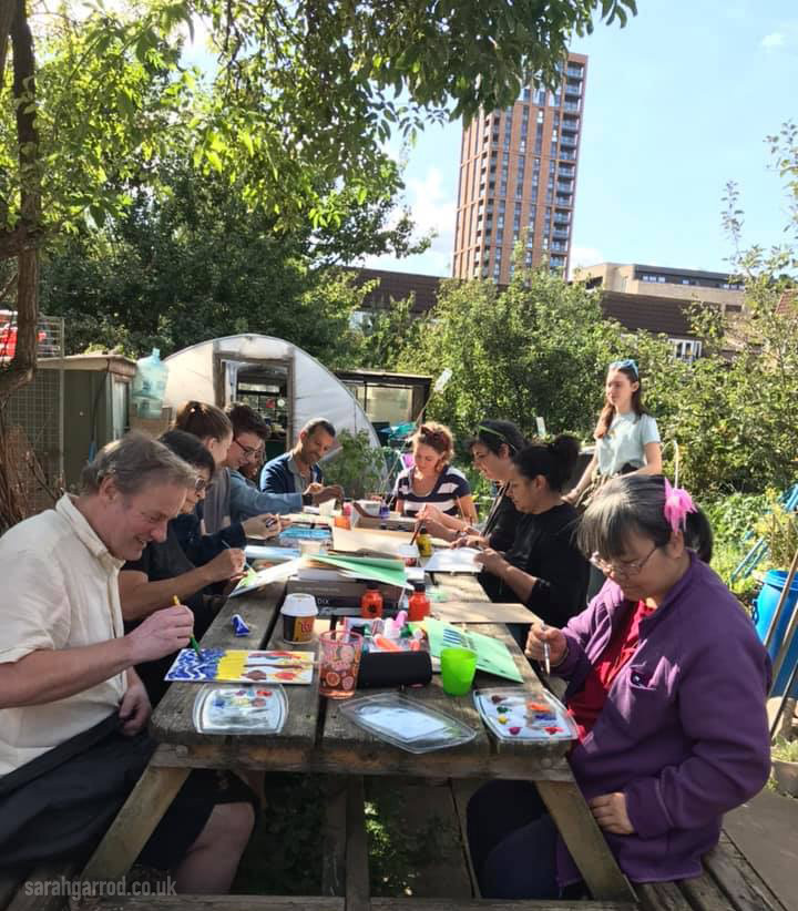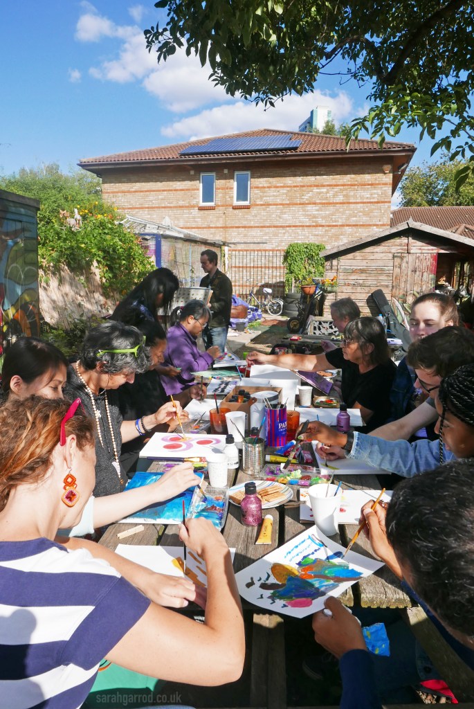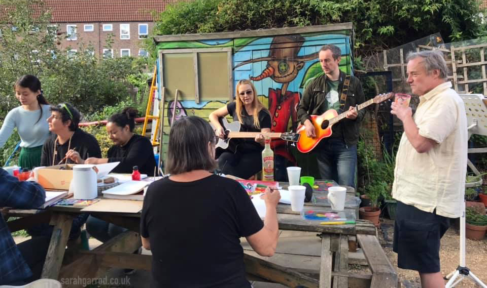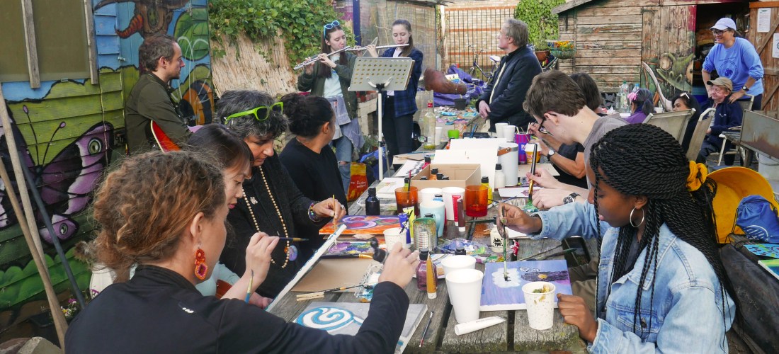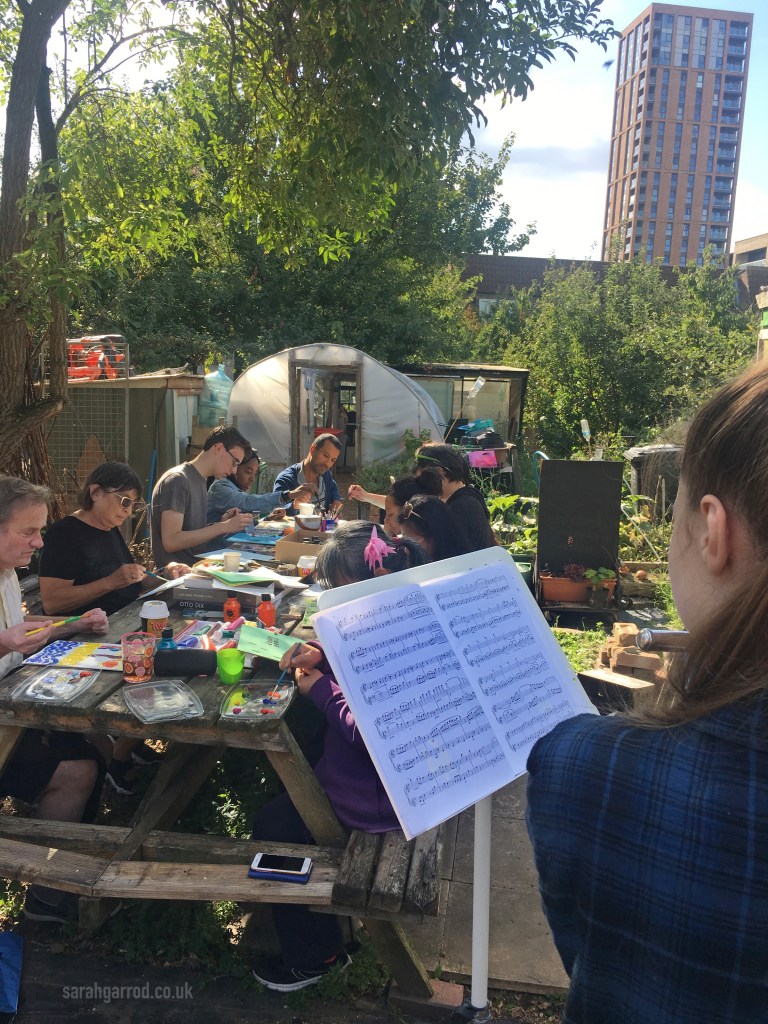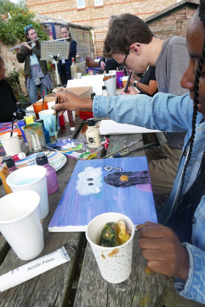A full house for this wellness workshop. Sarah led participants to paint freely in response to live music played by herself and a guitarist and 2 flautists. They also warmed up to a variety of contrasting recorded pieces, and drew inspiration from the natural environment of the John Evelyn Garden in Deptford. Everyone got to take home a canvas.