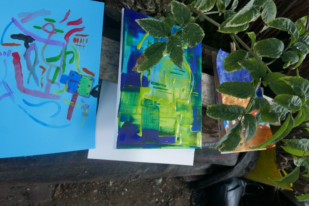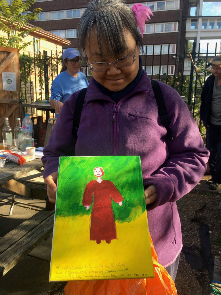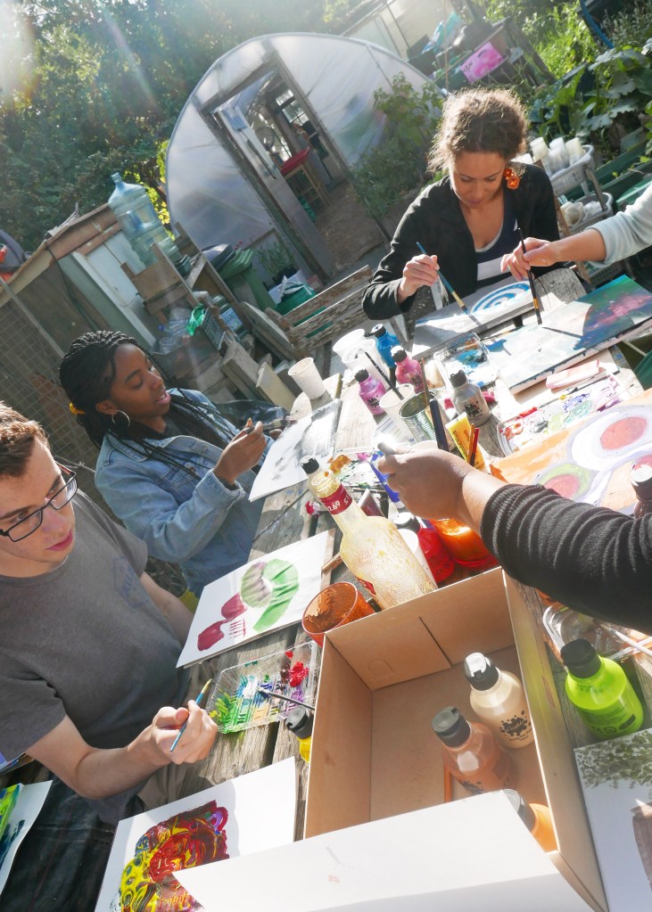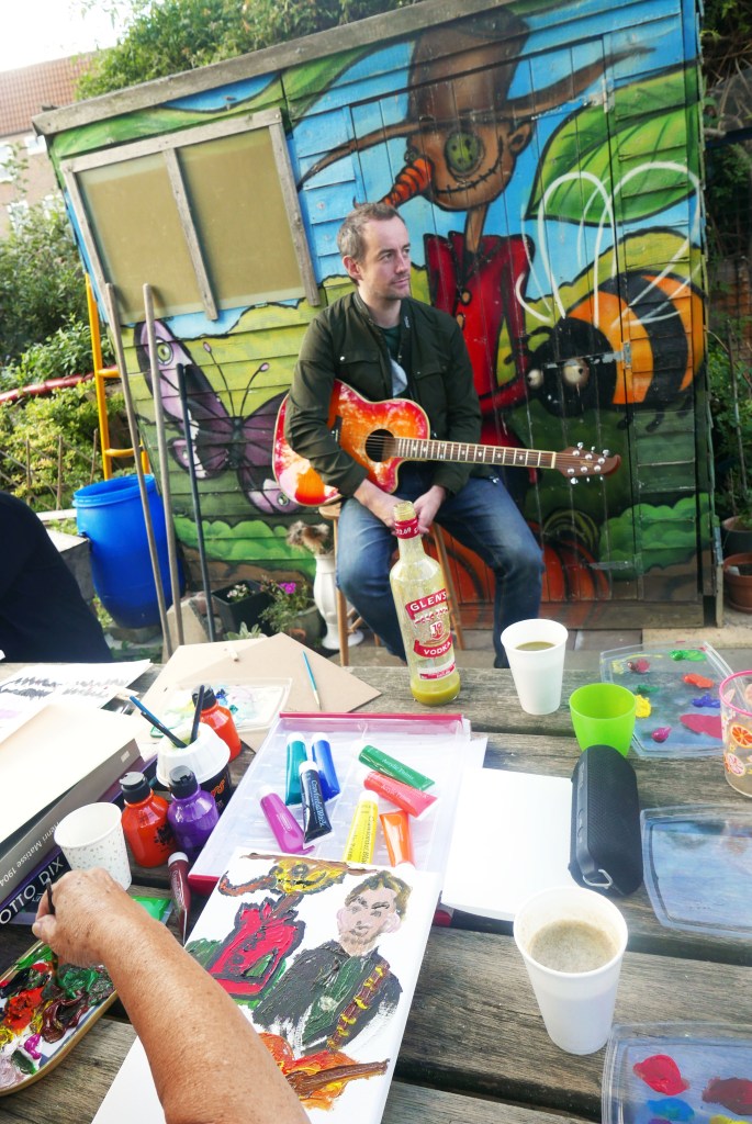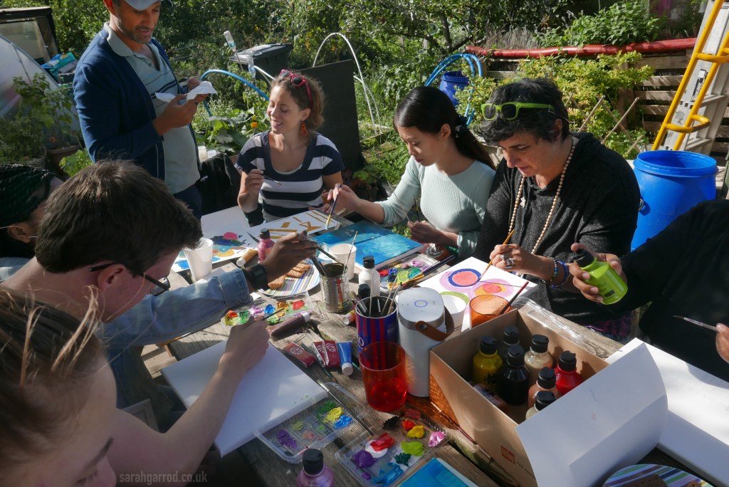 A full house for this wellness workshop. Sarah led participants to paint freely in response to live music played by herself and a guitarist and 2 flautists. They also warmed up to a variety of contrasting recorded pieces, and drew inspiration from the natural environment of the John Evelyn Garden in Deptford. Everyone got to take home a canvas.