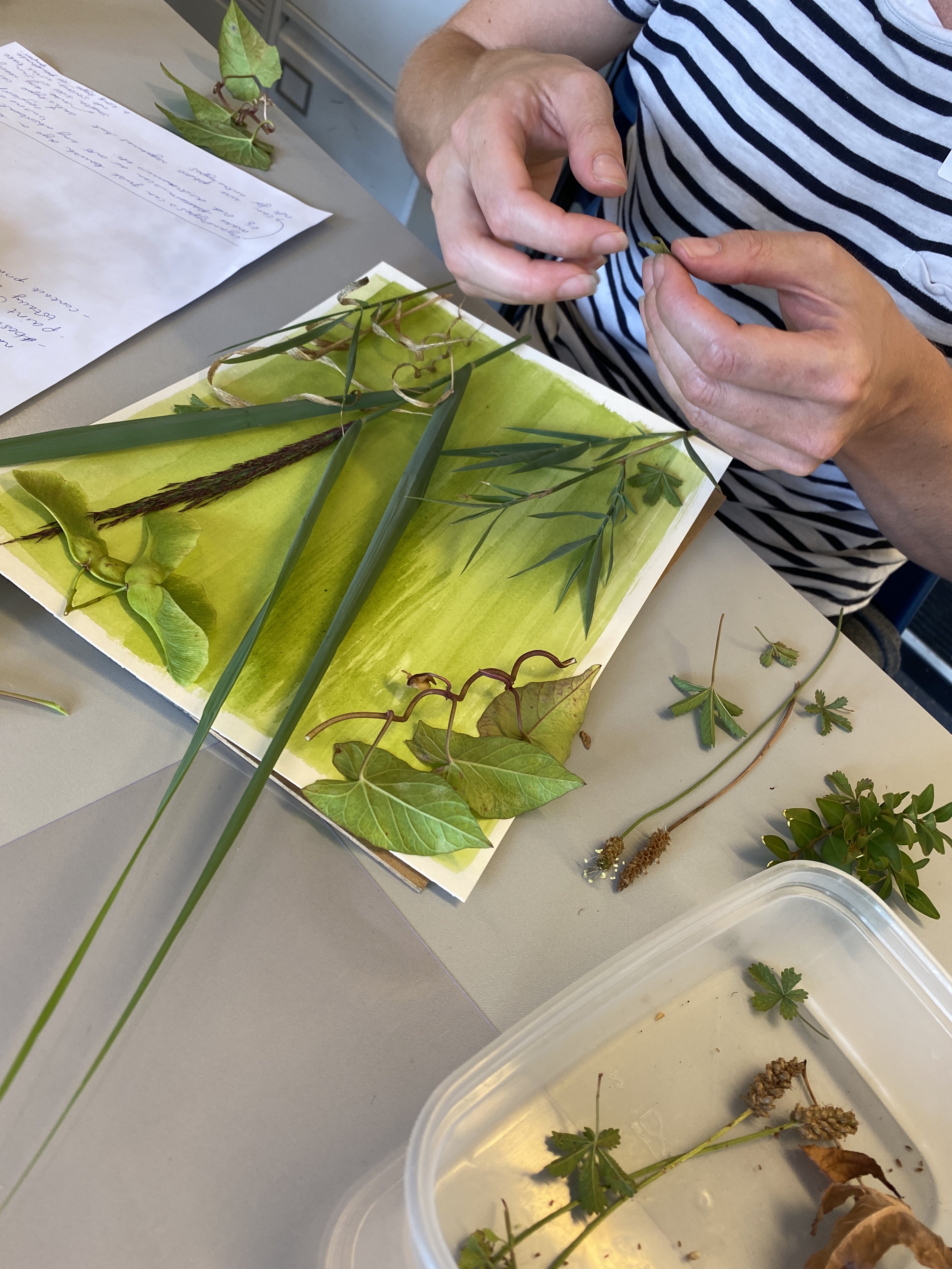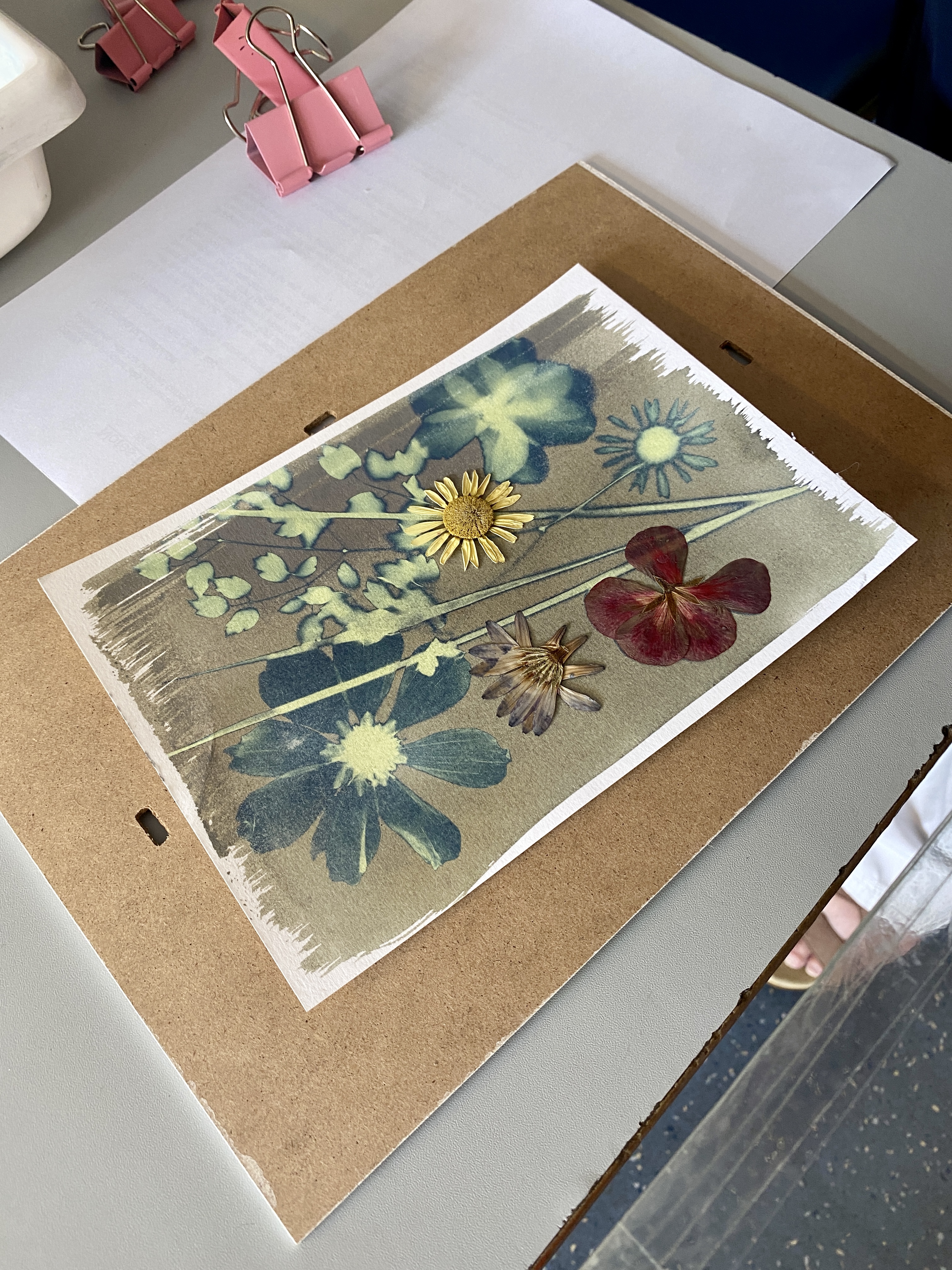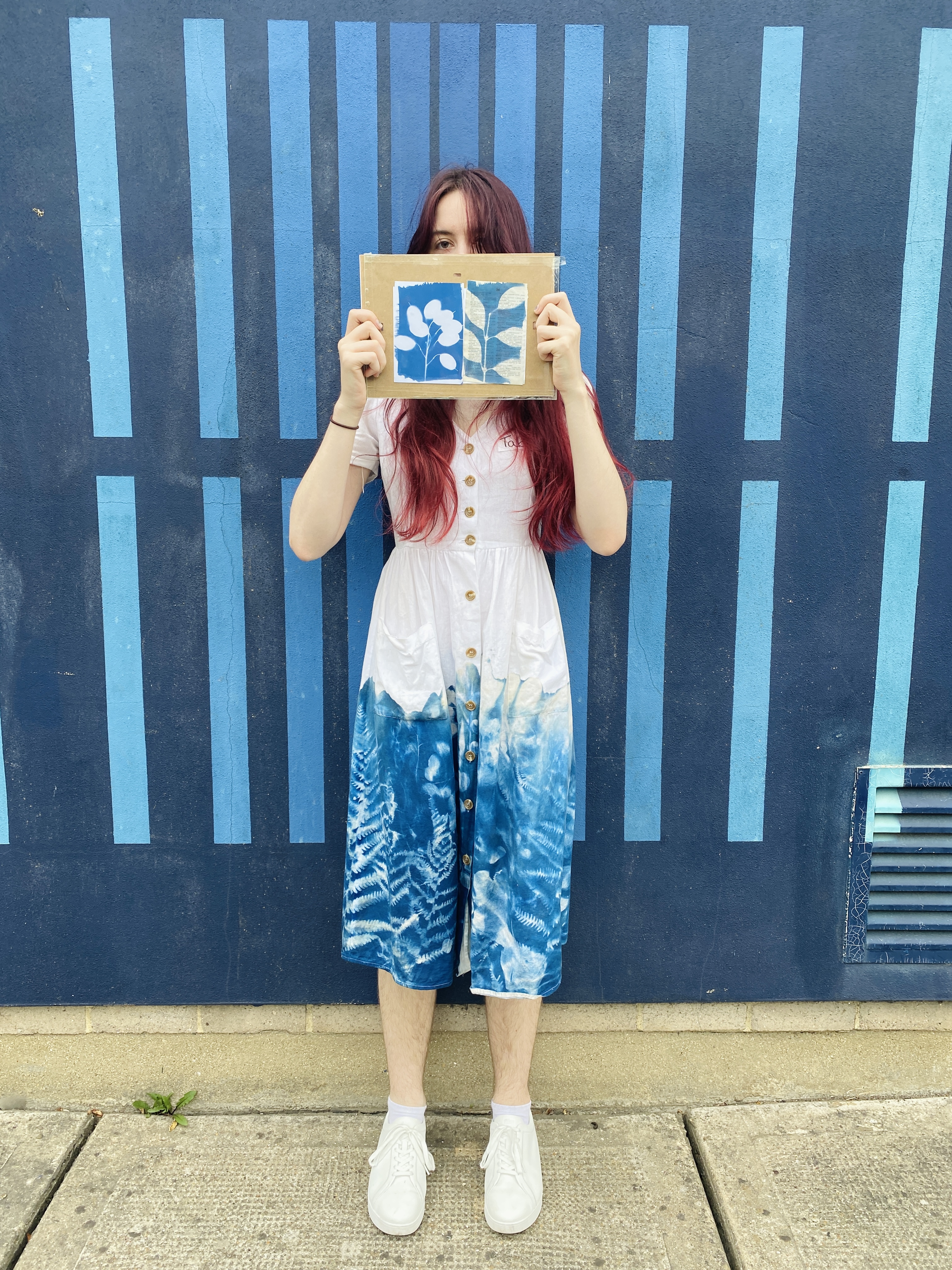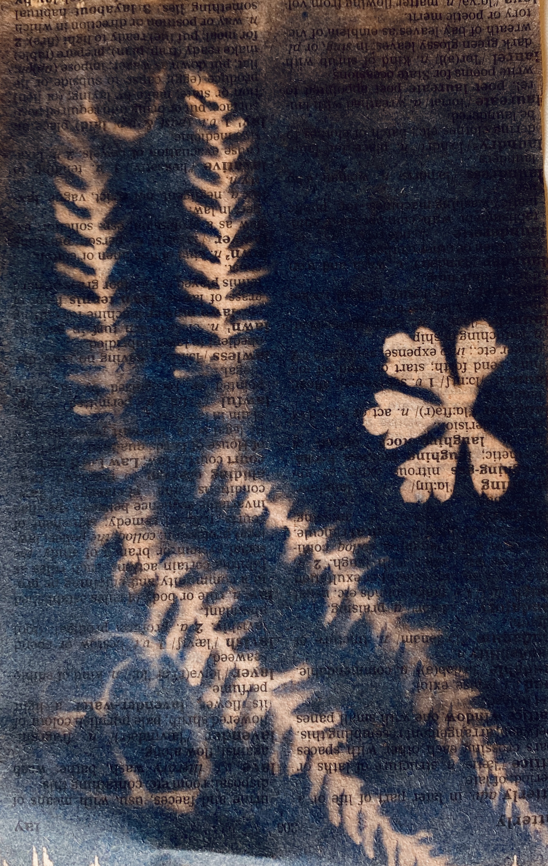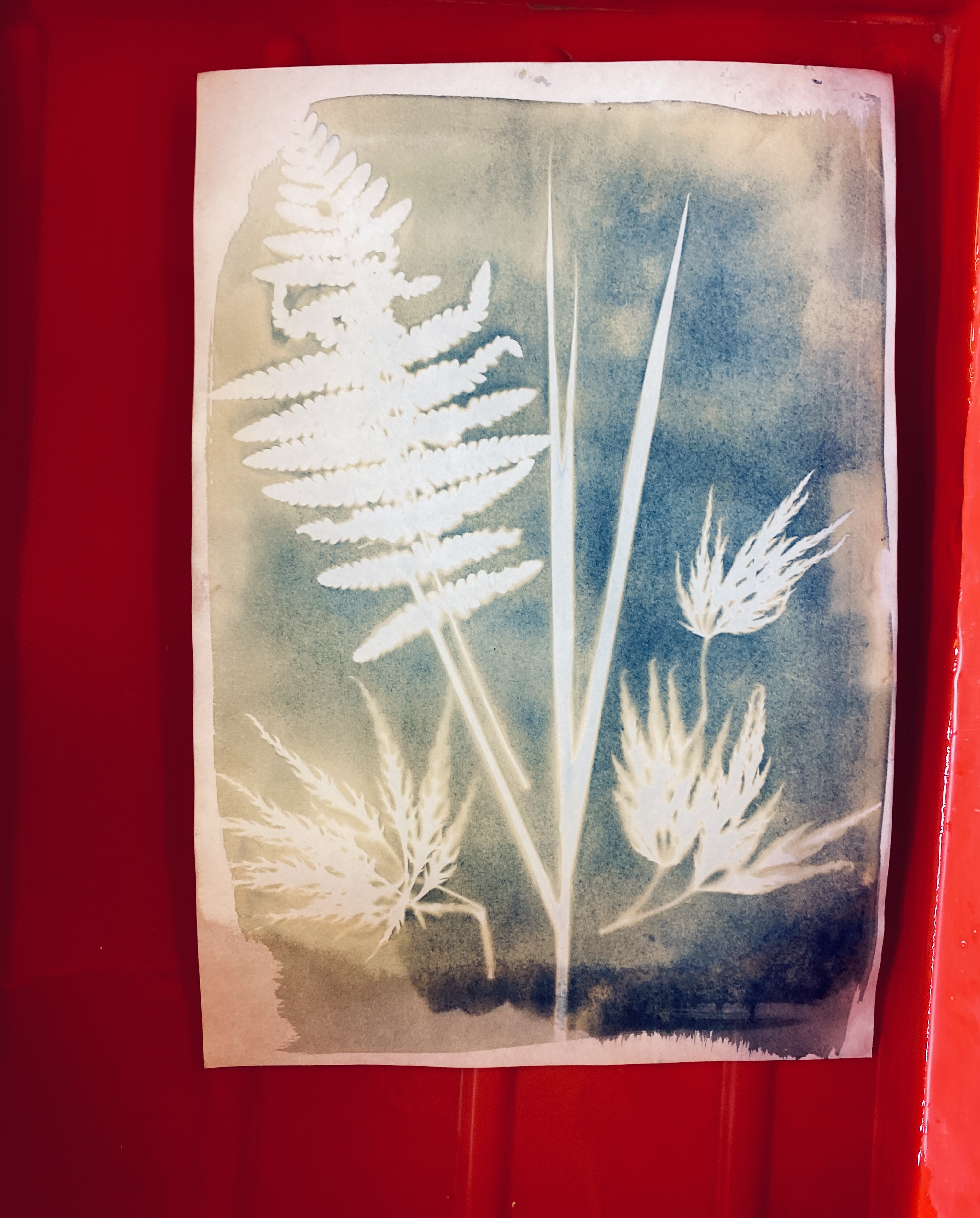 Wk1 : We collected plants from around the Belvedere Centre and arranged them on paper that Sarah had pre-coated with light-sensitive solution. We used the historic photographic process of “Cyanotype” printing which evolved in the 1800’s and uses sunlight during exposure.