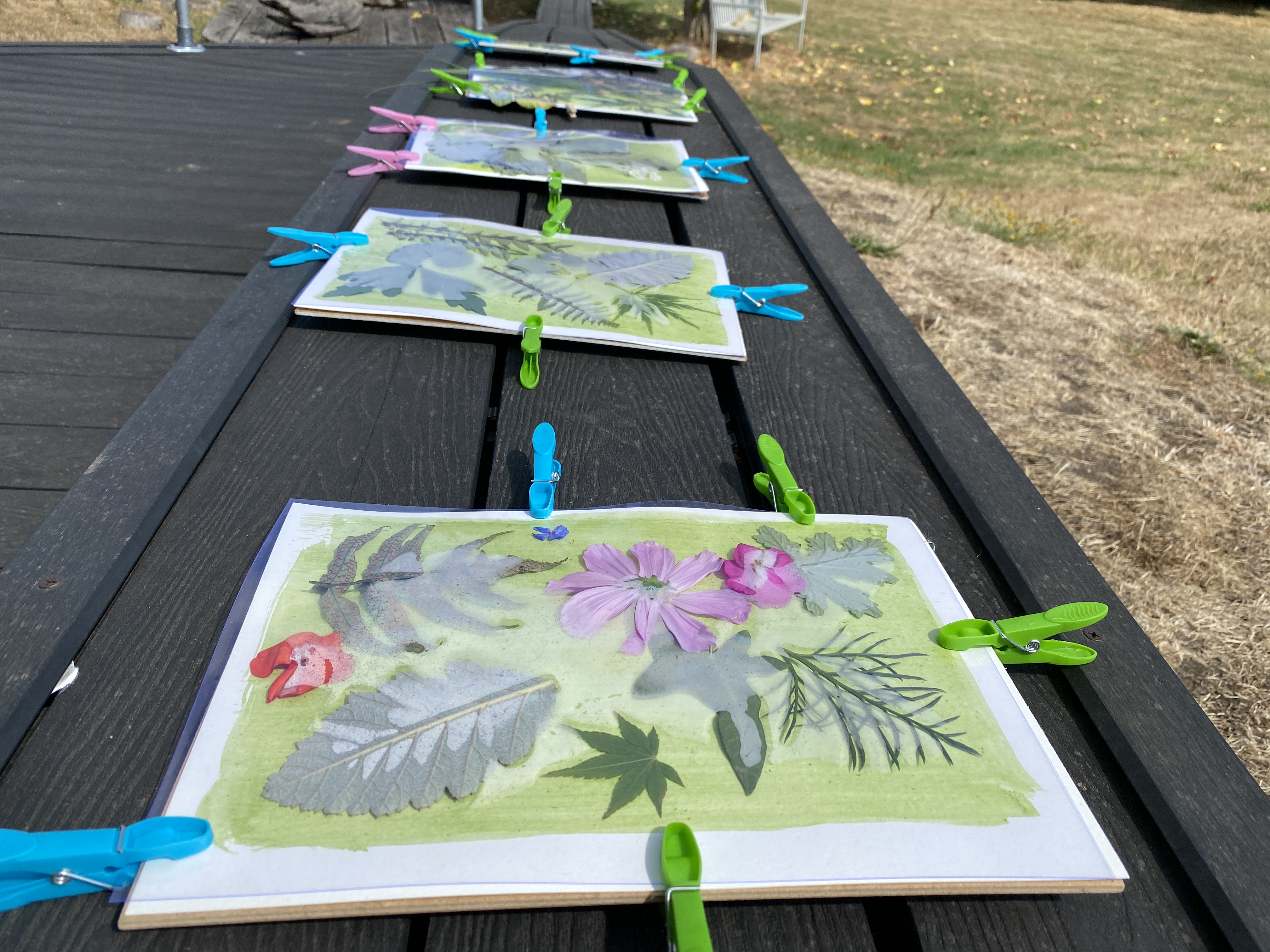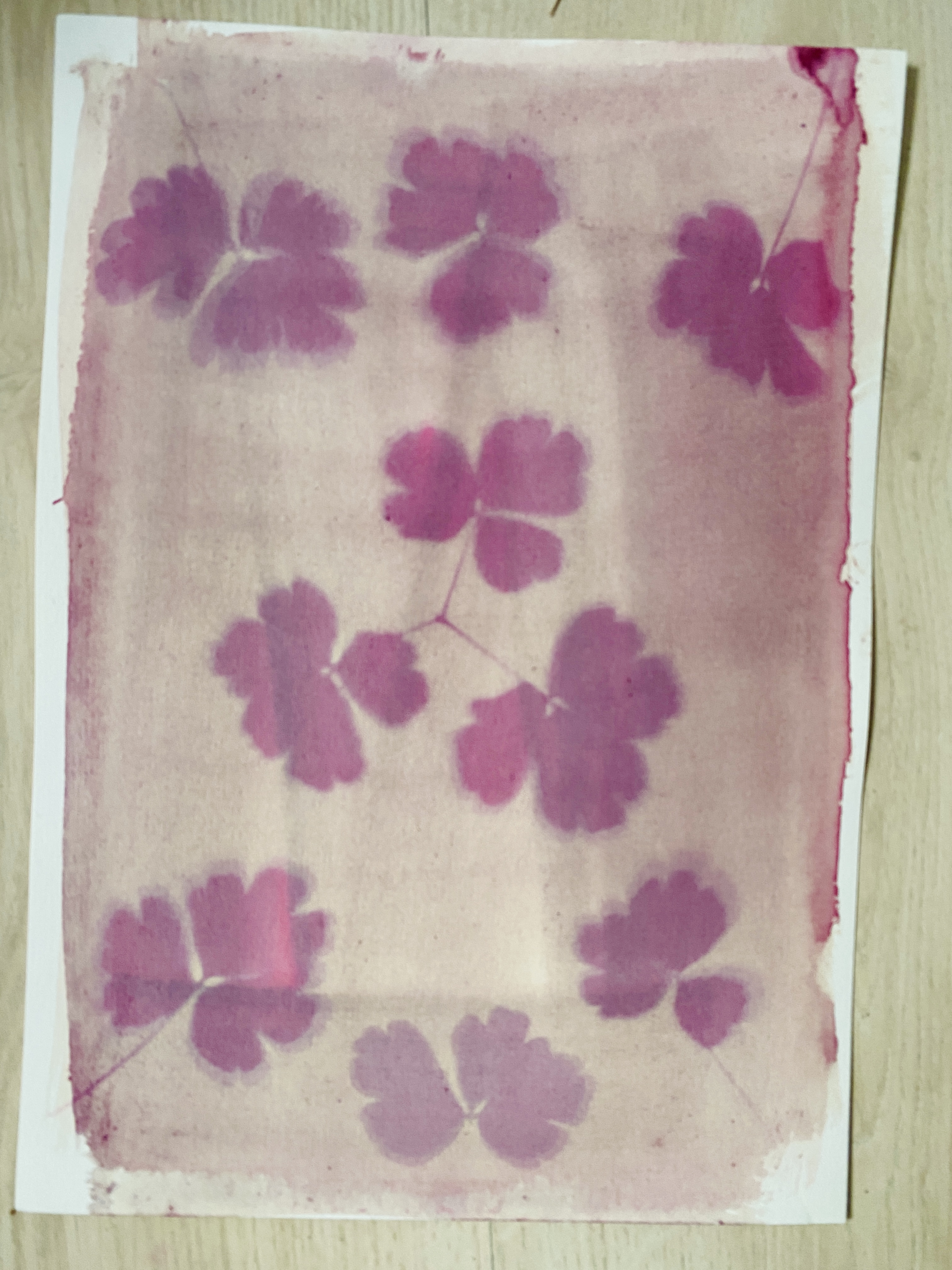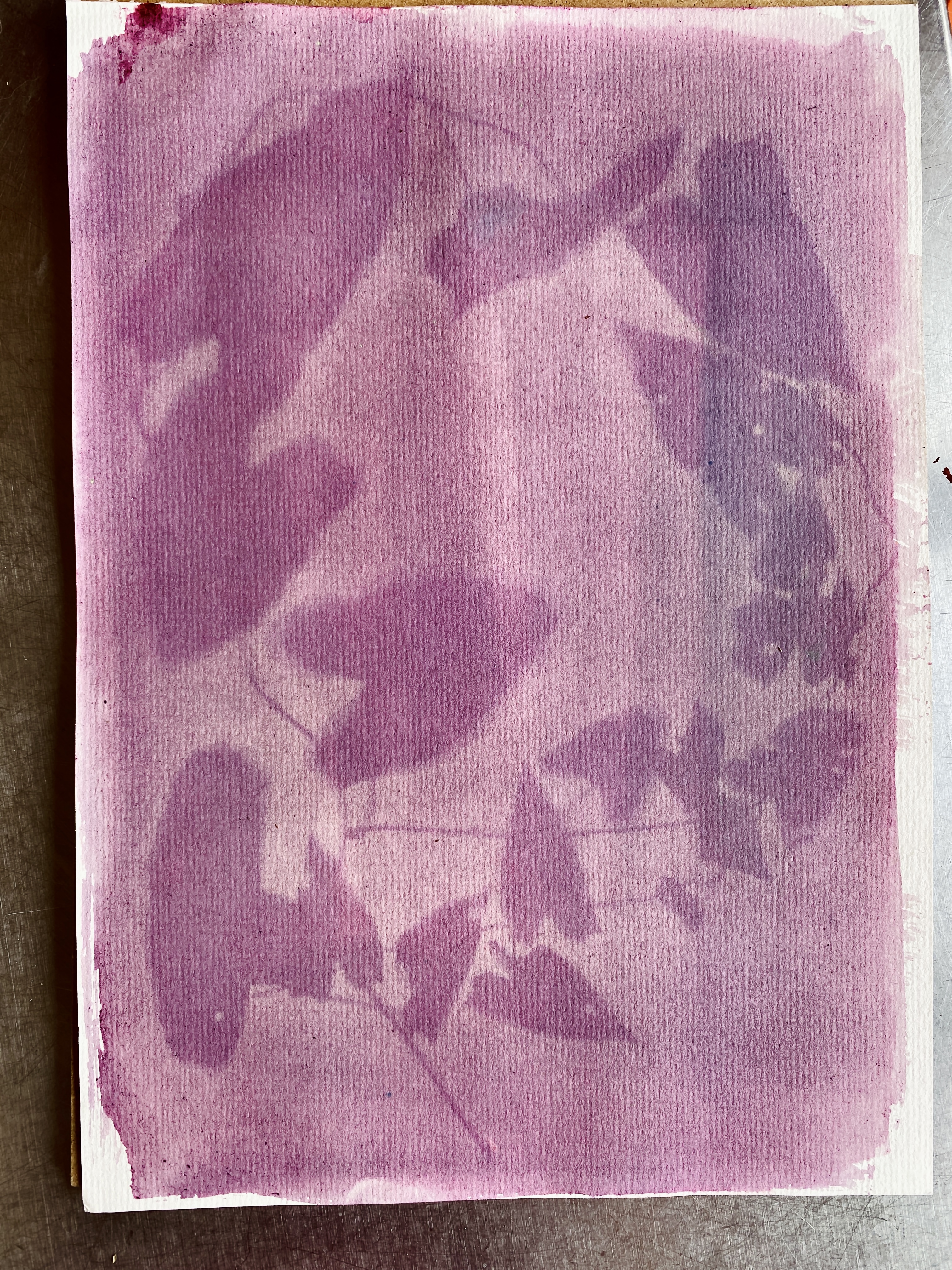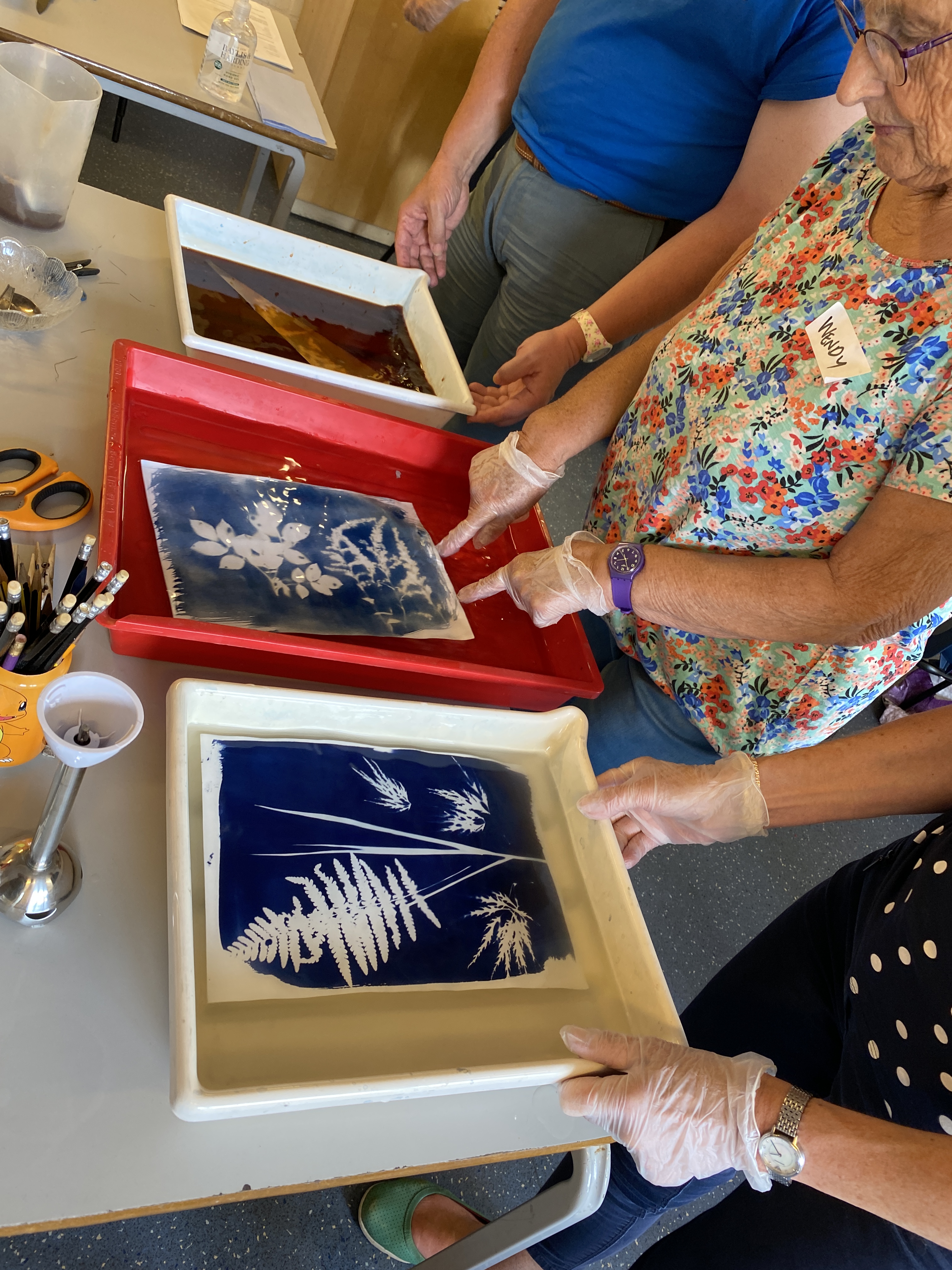 Wk 3. We collected blackberries from a nearby hedgerow and ground them using a pestle & mortar to make photo emulsion. We also made emulsions from spinach, beetroot and spices. We used plants , tea and coffee to tone our cyanotypes from the previous session. This session utilised all the rainbow of colour at our fingertips in Nature, all free, non-toxic and sustainable. Work was finished in time for the first World Anthotype Day.