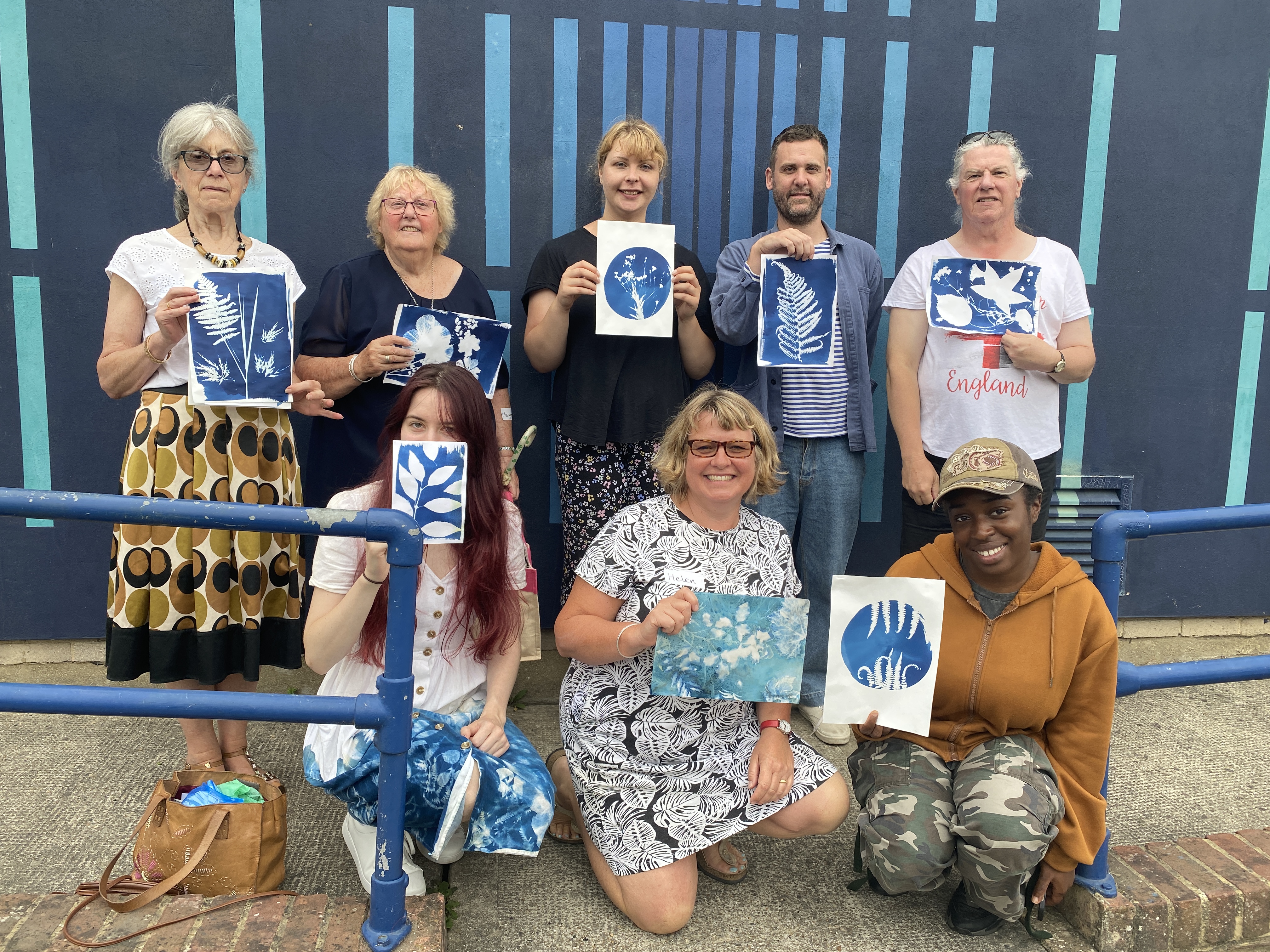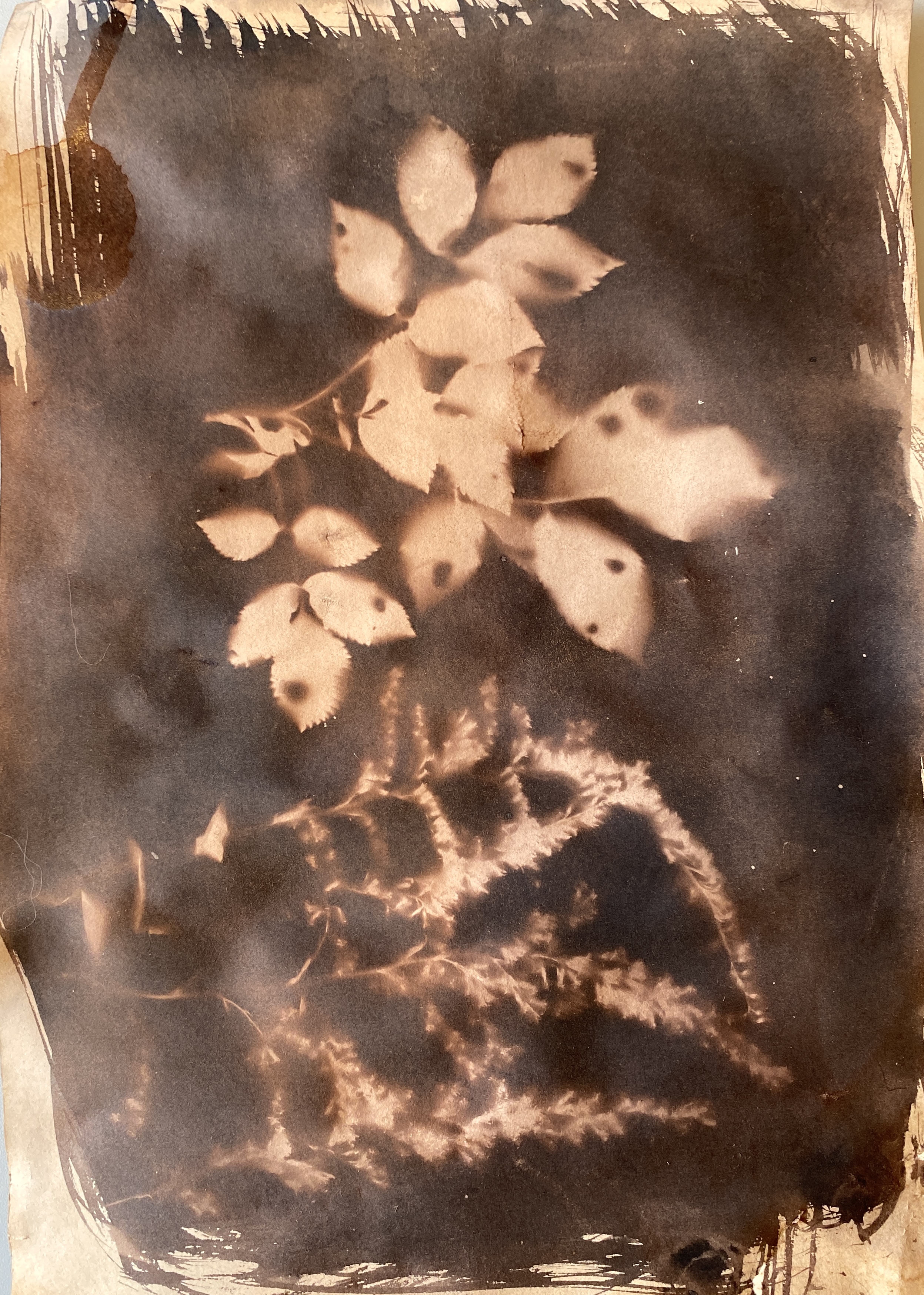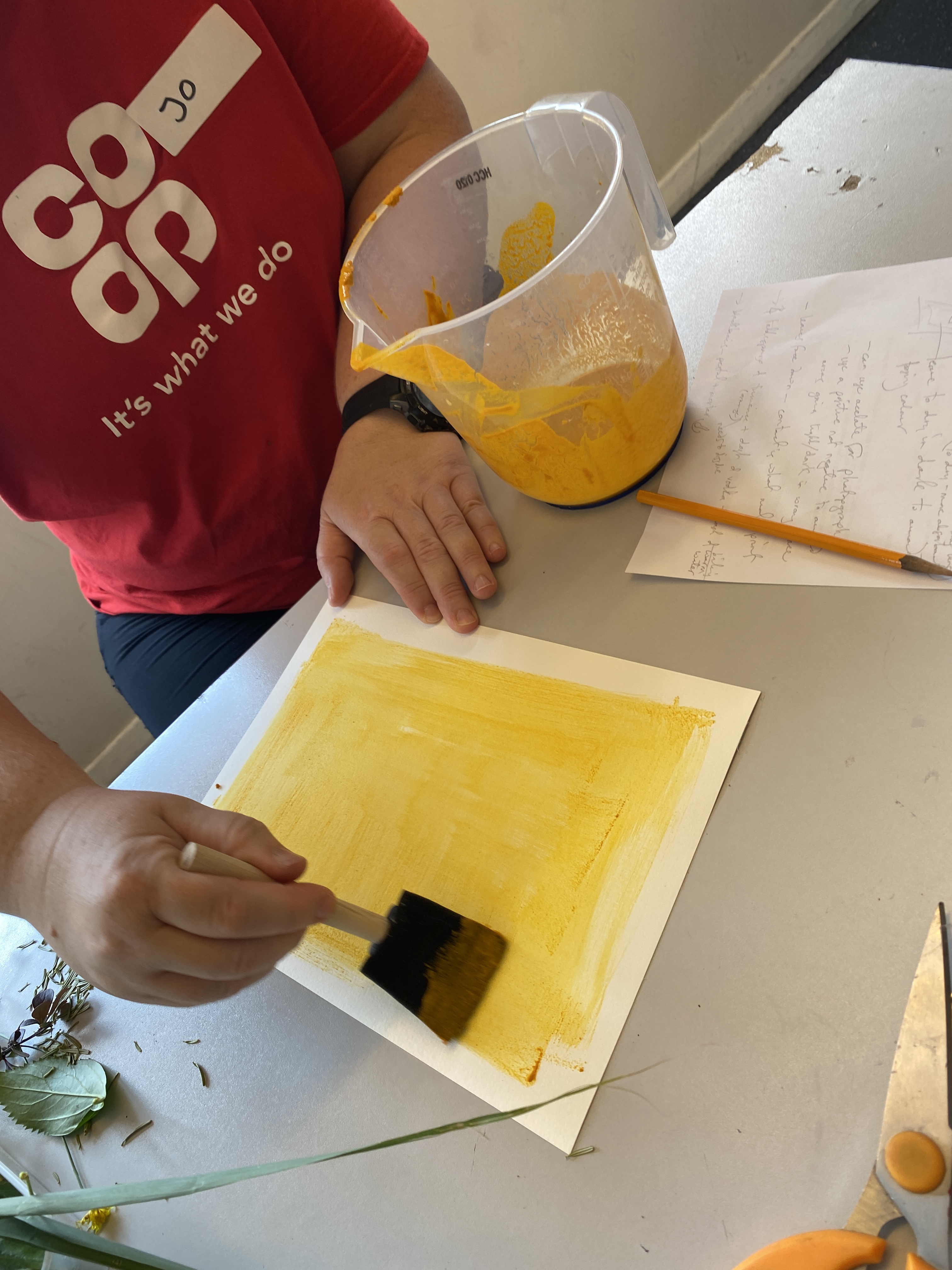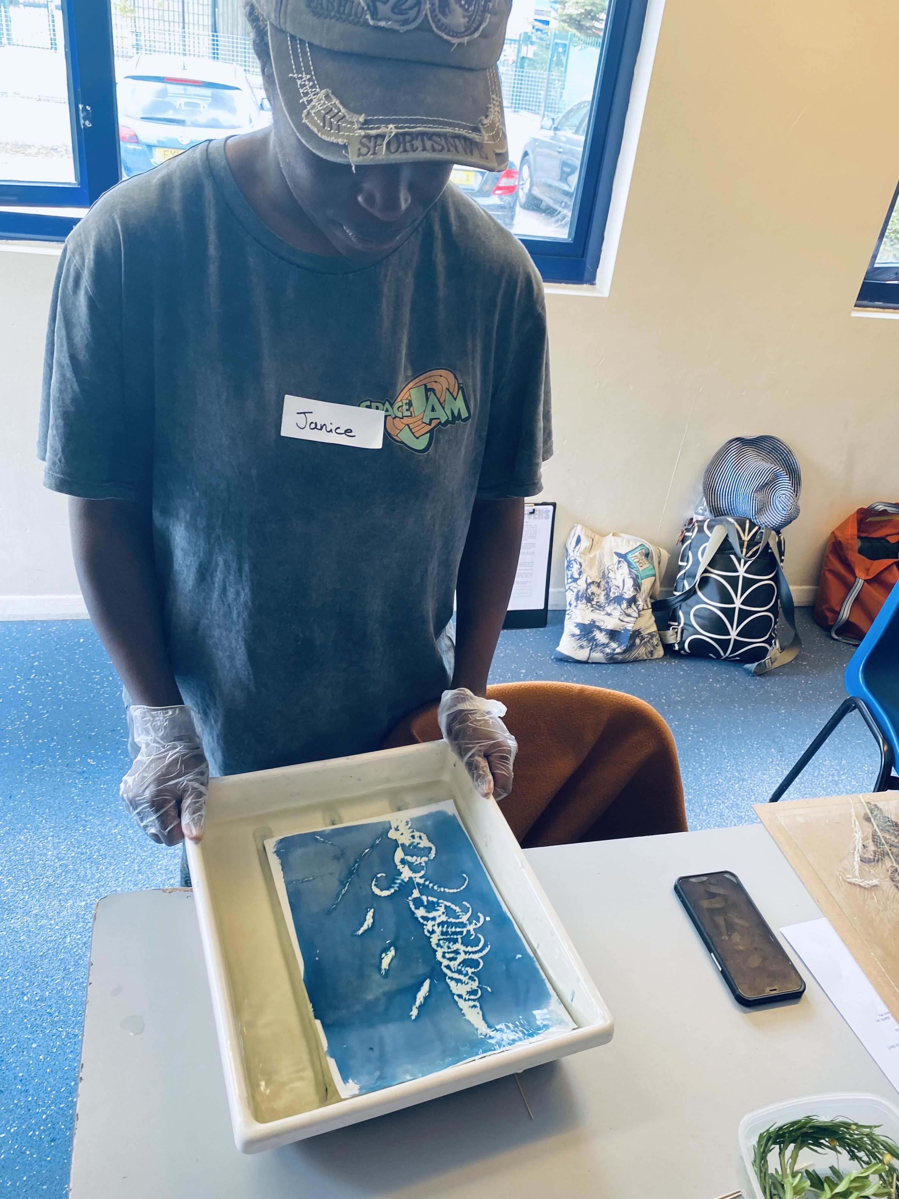Wk 3. We collected blackberries from a nearby hedgerow and ground them using a pestle & mortar to make photo emulsion. We also made emulsions from spinach, beetroot and spices. We used plants , tea and coffee to tone our cyanotypes from the previous session. This session utilised all the rainbow of colour at our fingertips in Nature, all free, non-toxic and sustainable. Work was finished in time for the first World Anthotype Day.