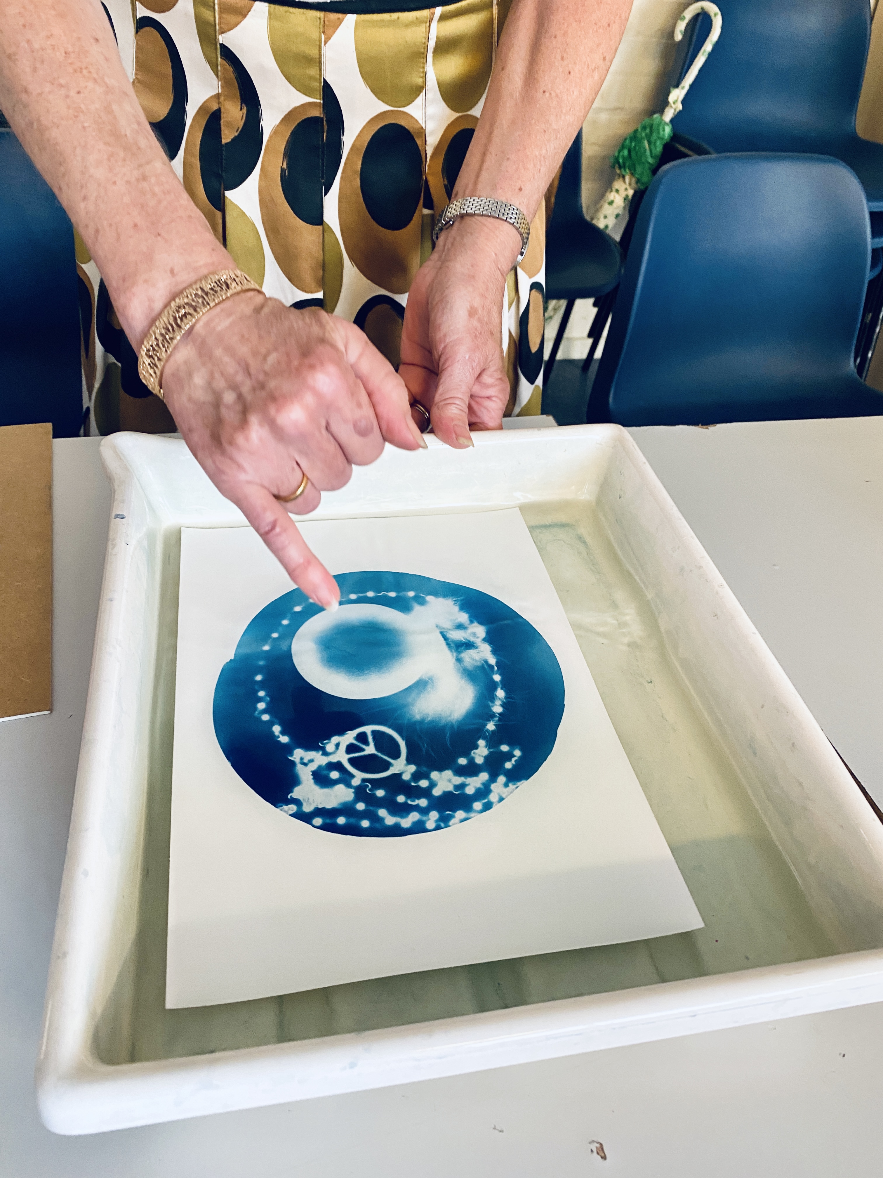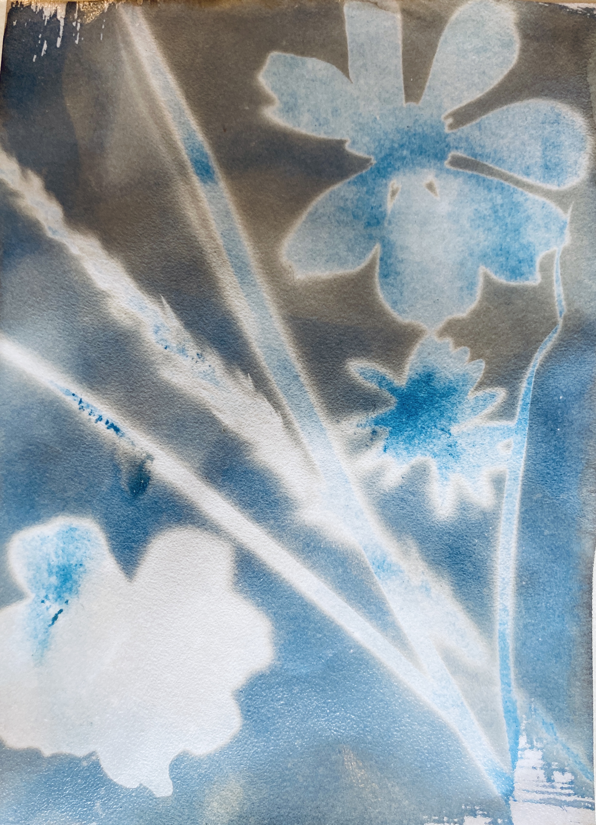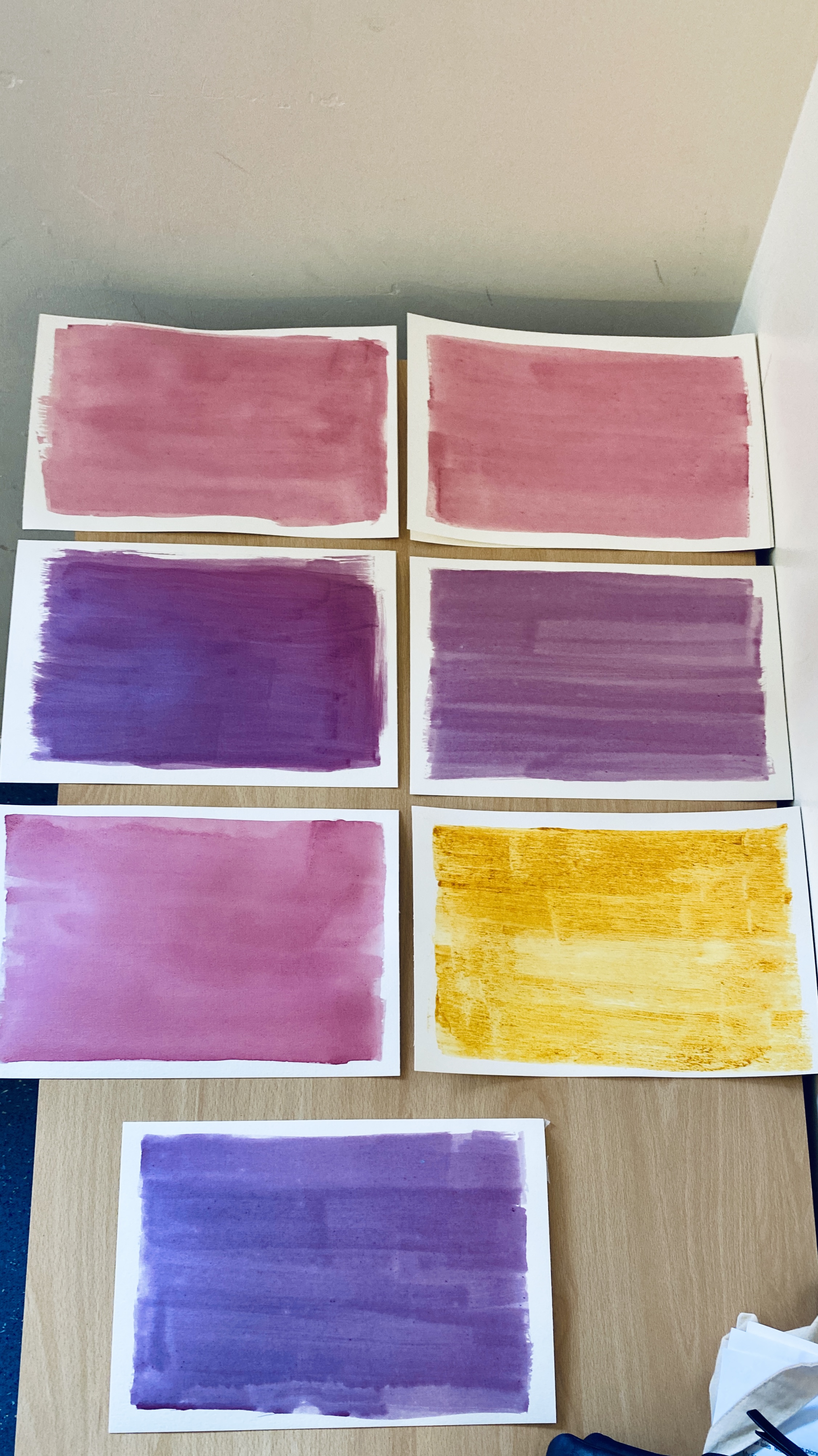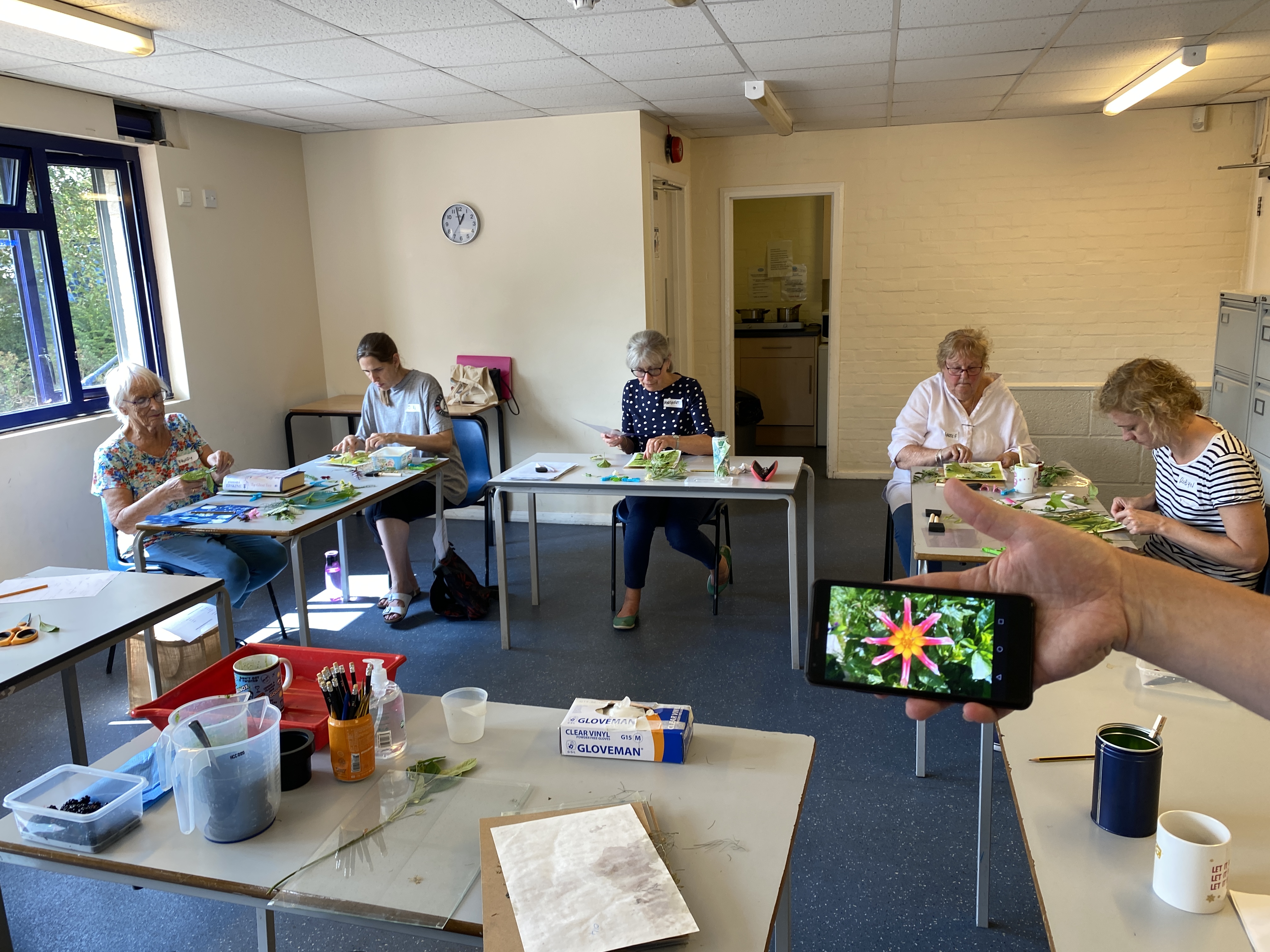 Wk 3. We collected blackberries from a nearby hedgerow and ground them using a pestle & mortar to make photo emulsion. We also made emulsions from spinach, beetroot and spices. We used plants , tea and coffee to tone our cyanotypes from the previous session. This session utilised all the rainbow of colour at our fingertips in Nature, all free, non-toxic and sustainable. Work was finished in time for the first World Anthotype Day.