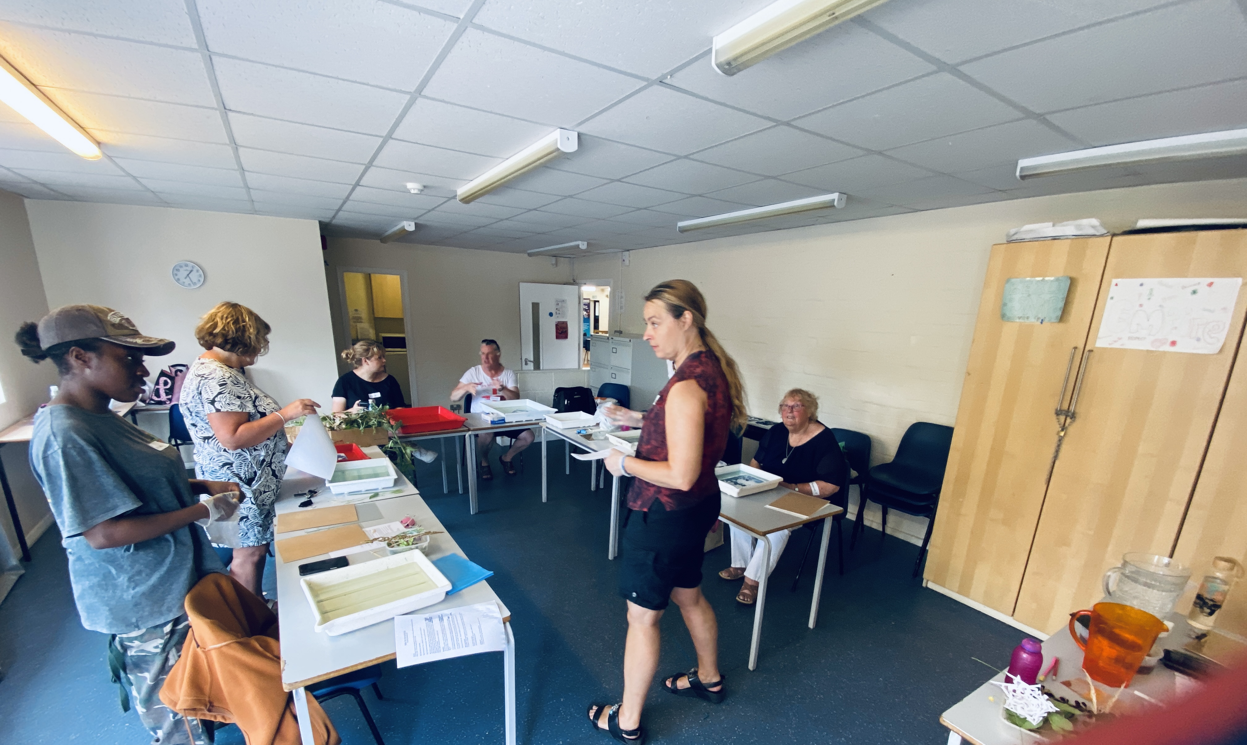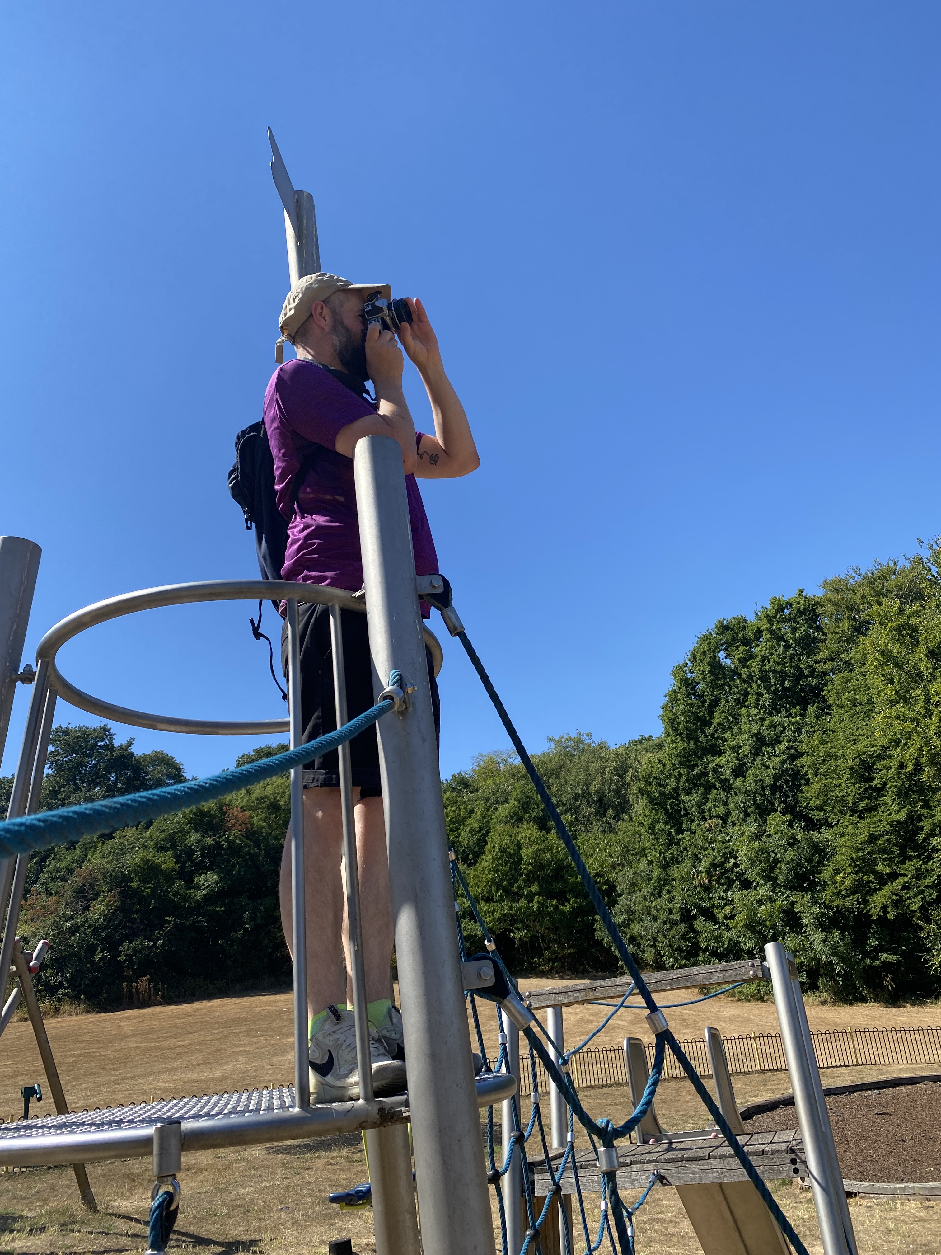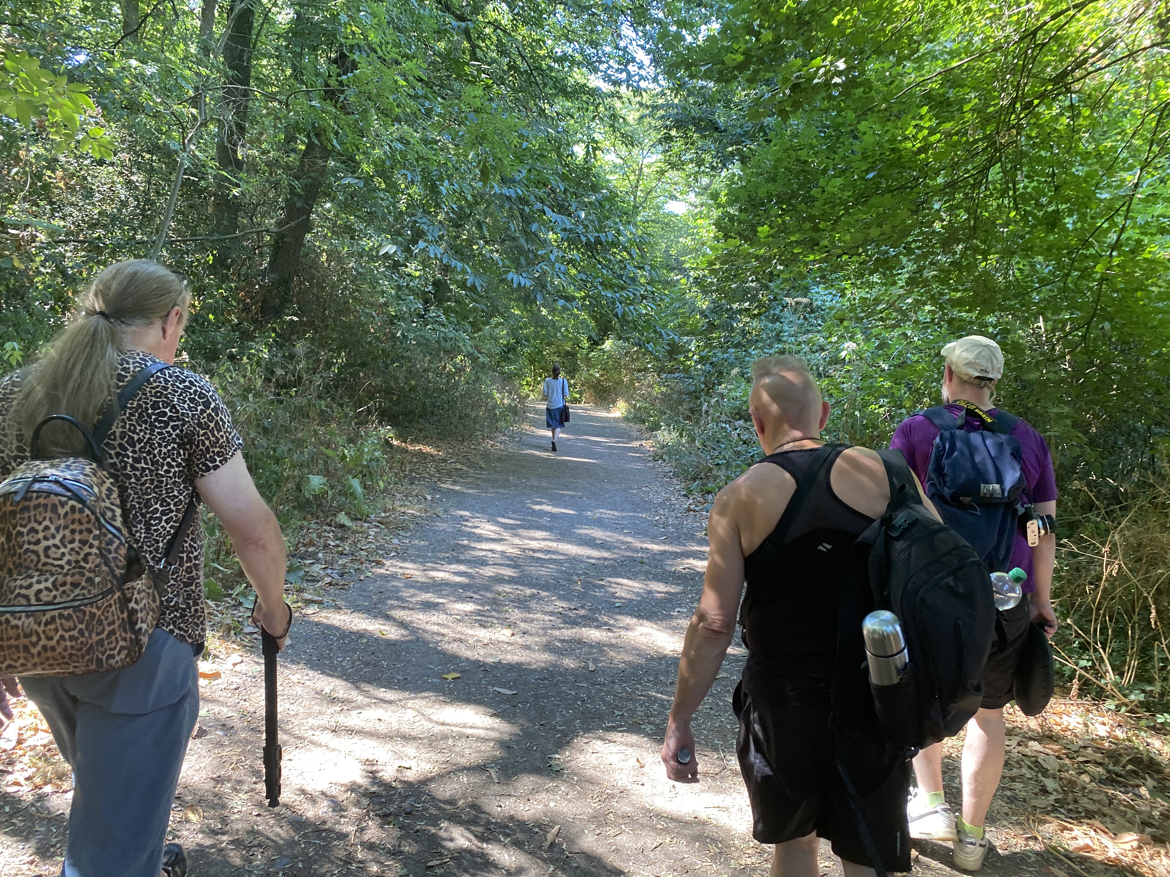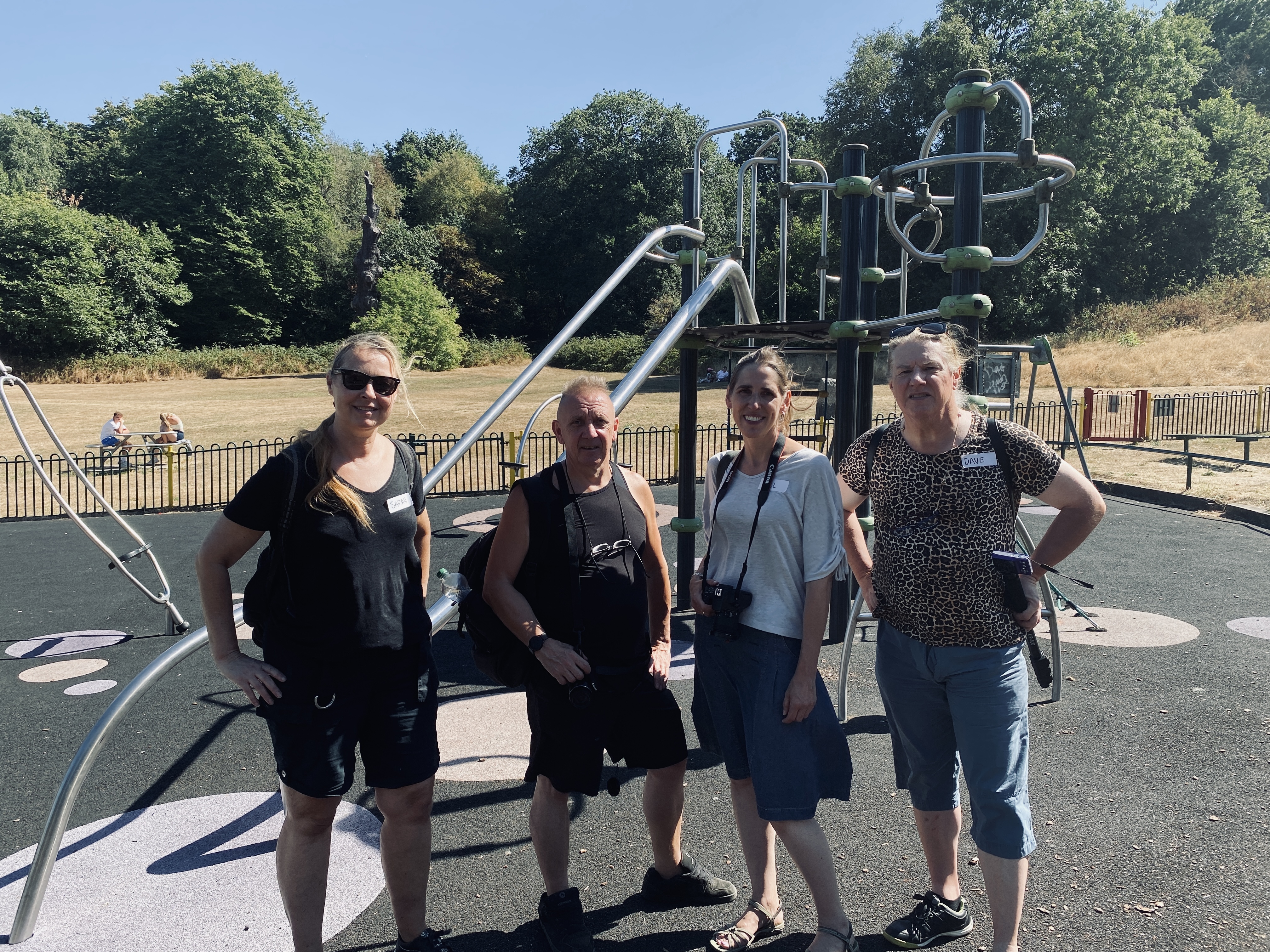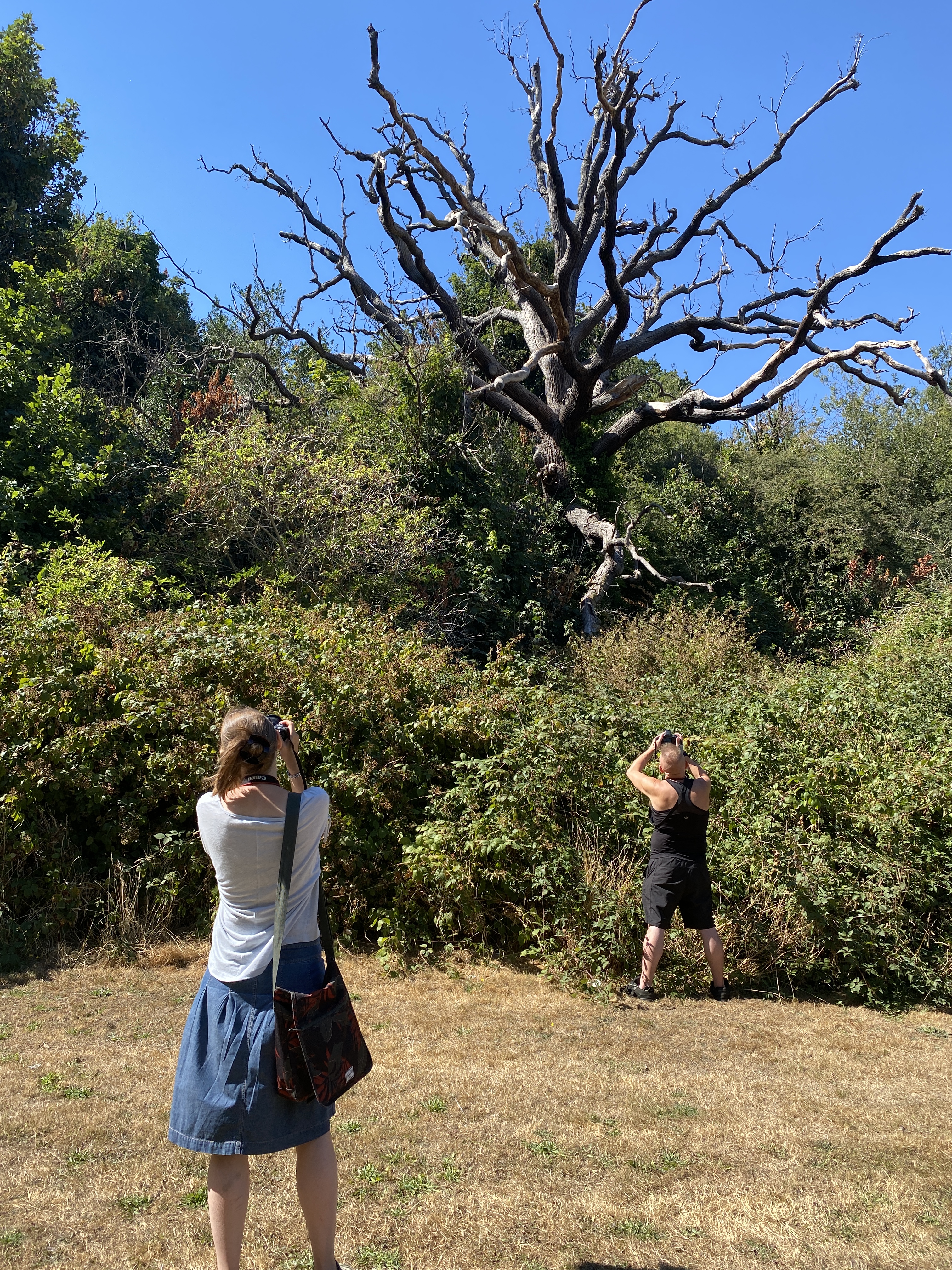 Wk 2: At the peak of the heatwave we explored local woodlands on a photowalk. Participants brought a whole range of cameras, from DSLRs to smartphones. We witnessed the falling burnt leaves of the “faux autumn”, and felt how the huge mature trees kept us cool in the shade and gave protection to other plants and wildlife. We looked at techniques of getting light into shadows under harsh overhead sun. We discussed the contrast between the plants and the urban buildings. It was gruelling in the heat, but a magical day with time for a picnic in the shade.